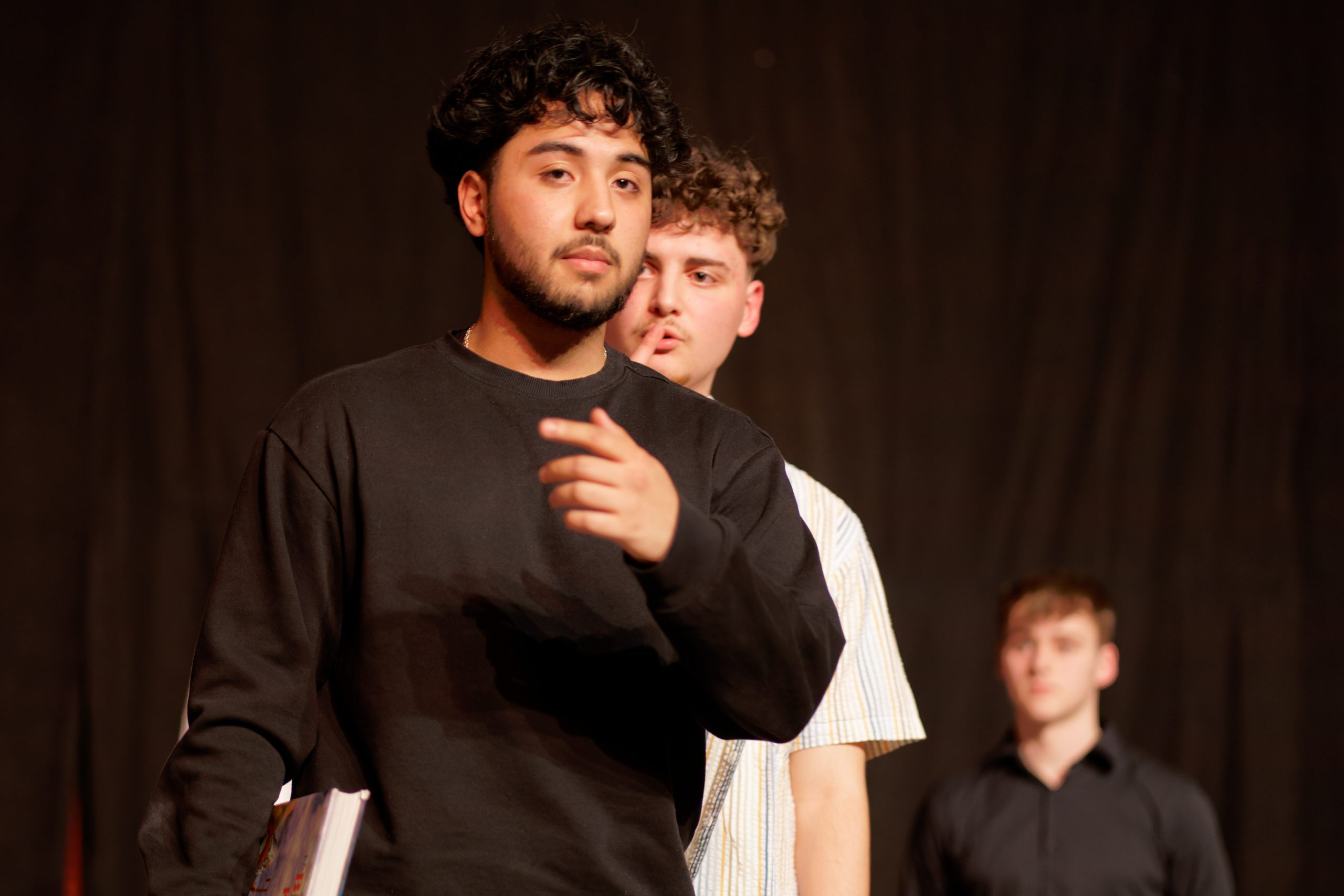 Zwei junge Männer in Sonnenbrillen und Strohhüten stehen auf einer Bühne und zeigen mit den Händen nach oben. Sie wirken begeistert und scheinen zu singen oder zu feiern. Der Hintergrund ist rot beleuchtet. Eine Frau in einem schwarzen Kleid mit Punkten steht hinter einer sitzenden jungen Frau, die ein weißes Kleid trägt und auf einem grauen Sessel sitzt. Die stehende Frau frisiert die sitzende Frau, die einen Blumenkranz im Haar hat. Der Hintergrund ist dunkel. Eine Person liegt auf einer Bühne auf einer Matte, trägt ein weißes Outfit und einen Strohhut. Im Hintergrund sind rote Vorhänge und eine gelbe Dekoration sichtbar. Die Person hat einen entspannten Gesichtsausdruck und die Arme sind locker ausgestreckt. Ein Mädchen in einem weißen Kleid sitzt auf einer Bank und trägt einen Blumenkranz im Haar. Sie hat lange, lockige Haare und schaut nachdenklich. Im Hintergrund ist eine Person zu sehen, die in heller Kleidung steht. Die Szene ist schwach beleuchtet und vermittelt eine ruhige Atmosphäre. Eine Person in traditioneller, gold- und weißfarbener Gewandung steht auf einer Bühne, mit einem Finger auf den Lippen, als Zeichen für Stille. Im Hintergrund ist eine weitere Person in lässiger Kleidung zu sehen, die sich in einer entspannten Haltung befindet. Die Bühne ist dekoriert und der Raum hat eine warme Atmosphäre. Drei junge Männer stehen auf einer Bühne vor einem schwarzen Vorhang. Der vordere Mann mit lockigem Haar trägt ein schwarzes Sweatshirt und hält ein Buch in der Hand. Hinter ihm steht ein Mann mit blonden, lockigen Haaren, der ein gestreiftes Hemd trägt. Der dritte Mann ist im Hintergrund und trägt ein schwarzes Hemd. Die Szene vermittelt eine dynamische Interaktion. Sechs Personen stehen auf einer Bühne und halten bunte Plakate mit verschiedenen Aufschriften. Sie sind in schwarze Kleidung gekleidet. Im Hintergrund ist ein schwarzer Vorhang zu sehen. Auf der rechten Seite steht ein Hund. Die Stimmung wirkt engagiert und aktiv. Eine Gruppe von sieben Menschen steht auf einer Bühne. Sie halten bunte Plakate mit verschiedenen Slogans. Ein Plakat fordert Eine Theateraufführung mit mehreren Darstellern. Im Vordergrund stehen zwei Personen, eine in einem weißen Kleid und eine in heller Kleidung, die miteinander sprechen. Im Hintergrund sind weitere Personen in neutraler Kleidung, die die Szene beobachten. Alle Darsteller haben weiße Gesichter, was zur künstlerischen Darstellung beiträgt. Der Bühnenbereich ist mit einem grünen Teppich ausgelegt, und im Hintergrund sind Möbel und Dekorationen sichtbar. Eine Gruppe von acht jungen Menschen steht auf einer Bühne. Sie tragen unterschiedliche Kleidung, darunter ein weißes Kleid, ein schwarzes Outfit und eine goldene Robe. Einige der Personen lächeln und heben die Hände, während andere entspannt stehen. Der Hintergrund ist schwarz, und der Bühnenboden ist grün. Gruppe von sechs Personen auf einer Bühne, die nebeneinander stehen. Sie tragen unterschiedliche Kleidung, darunter lässige Outfits und eine formelle Robe. Im Hintergrund ist ein schwarzes Vorhang zu sehen. Eine der Personen, rechts, hält einen Blumenstrauß und spricht. Der Boden ist mit einem grünen Teppich bedeckt. Eine Gruppe von sieben Personen steht auf einer Bühne. Sie tragen verschiedene Kleidungsstile, darunter ein weißes Kleid, ein schwarzes Kleid und lässige Kleidung. Alle halten eine Rose in der Hand. Im Hintergrund ist ein schwarzer Vorhang und ein graues Sofa sichtbar. Die Szene vermittelt einen festlichen Anlass.