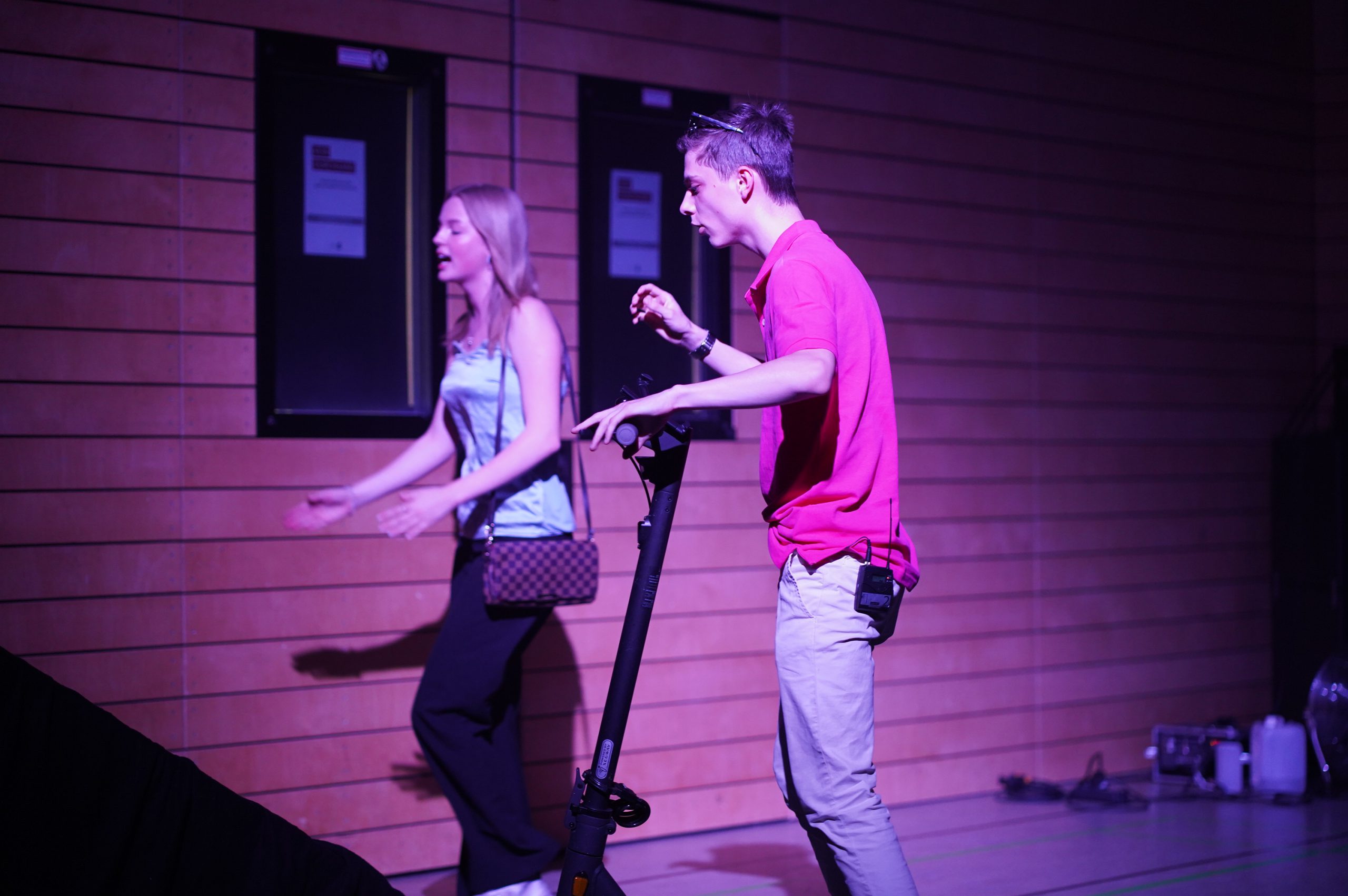 Technisch wurden dabei alle Möglichkeiten unseres Forums genutzt. Wir erlebten Nebel, Schattenspiele, Discostimmung, Leuchtschrift und besprühte Wände, es wurde Fahrrad und Roller gefahren und 20 Schauspieler agierten gleichzeitig auf der Bühne im Rhythmus unserer heutigen, schnelllebigen Welt, um kurz darauf von einer gescheiterten Existenz erschossen zu werden.