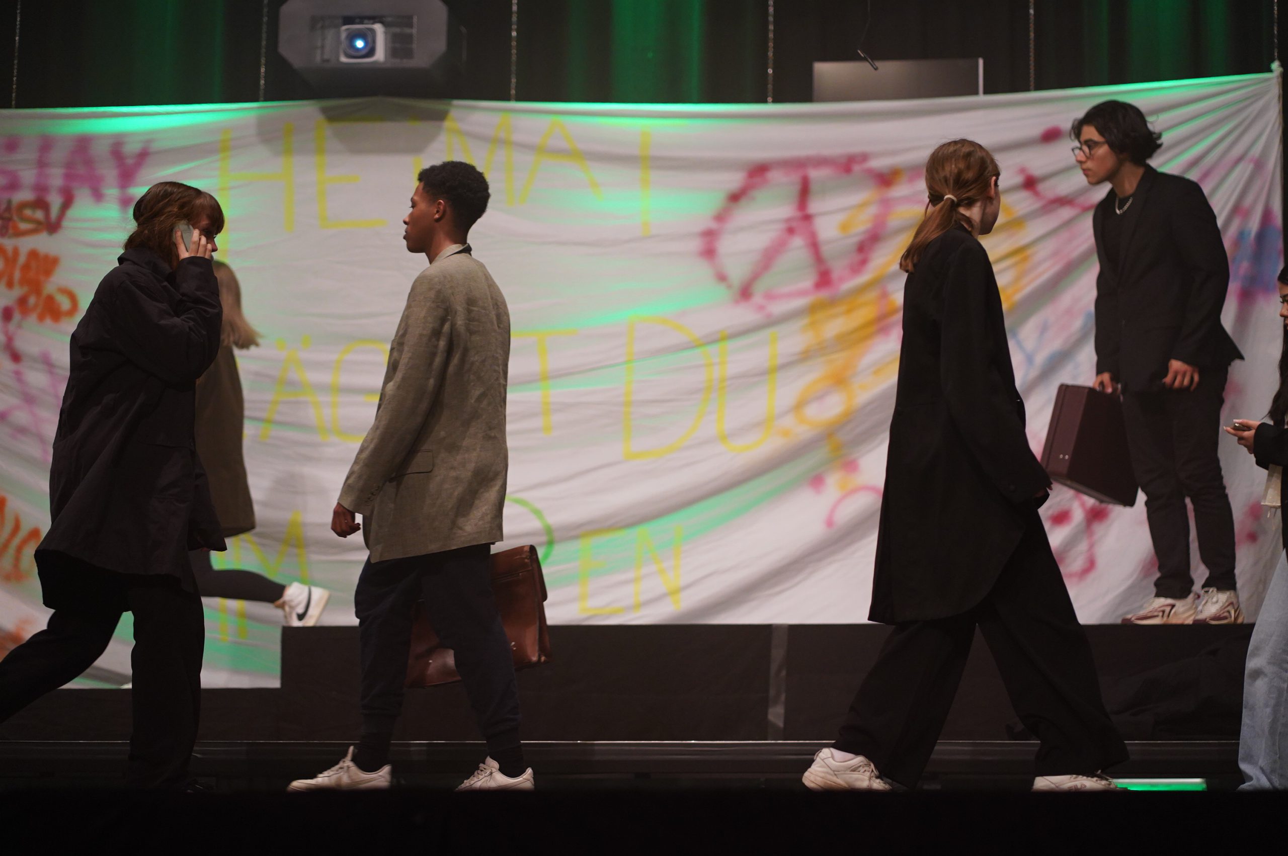 Technisch wurden dabei alle Möglichkeiten unseres Forums genutzt. Wir erlebten Nebel, Schattenspiele, Discostimmung, Leuchtschrift und besprühte Wände, es wurde Fahrrad und Roller gefahren und 20 Schauspieler agierten gleichzeitig auf der Bühne im Rhythmus unserer heutigen, schnelllebigen Welt, um kurz darauf von einer gescheiterten Existenz erschossen zu werden.