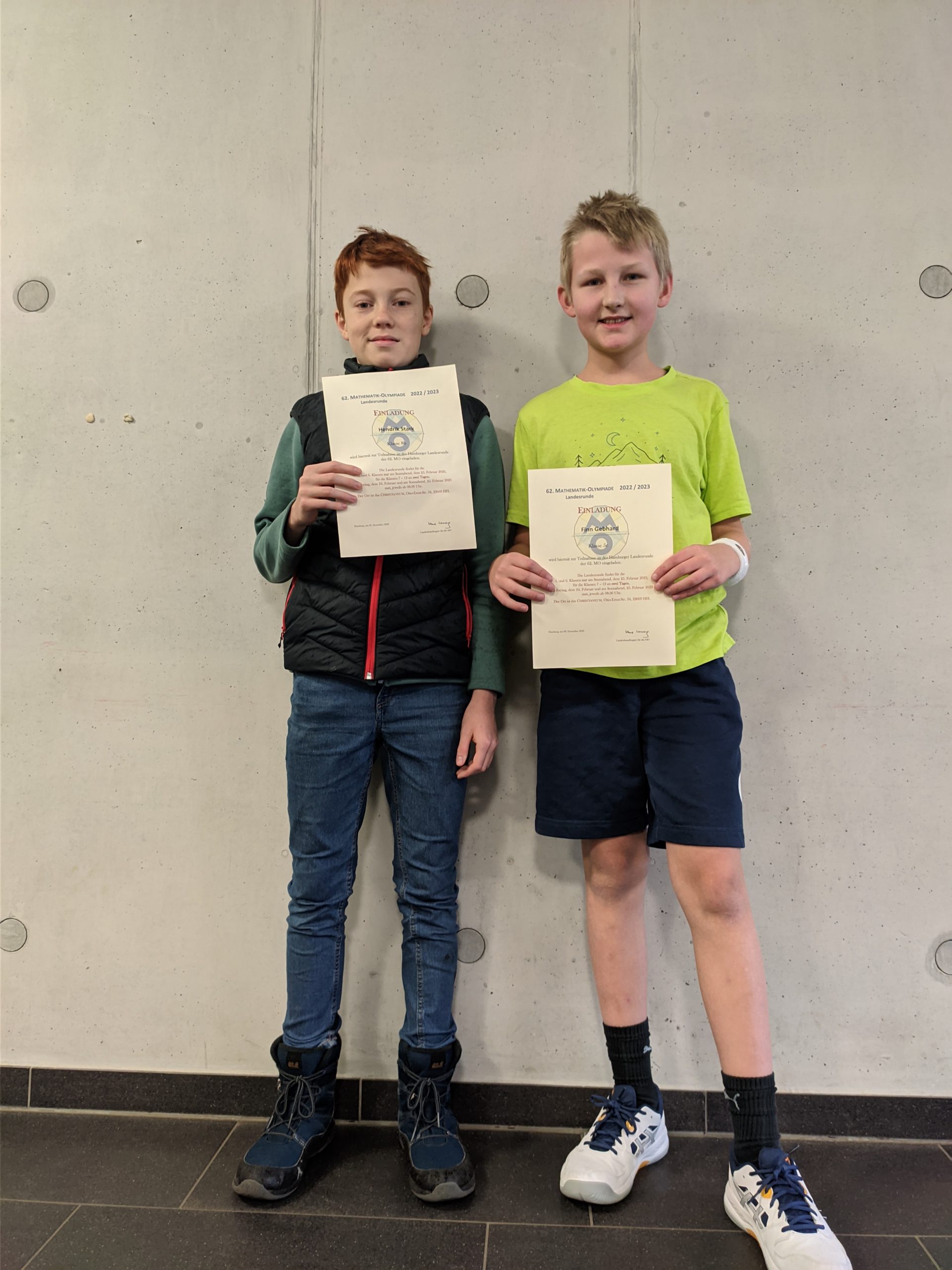 Zwei Jungen stehen lächelnd vor einer grauen Wand und halten ein Zertifikat oder eine Urkunde in den Händen. Der Junge links hat rote Haare und trägt einen schwarzen Pullover, während der Junge rechts blond ist und ein hellgrünes T-Shirt anhat.