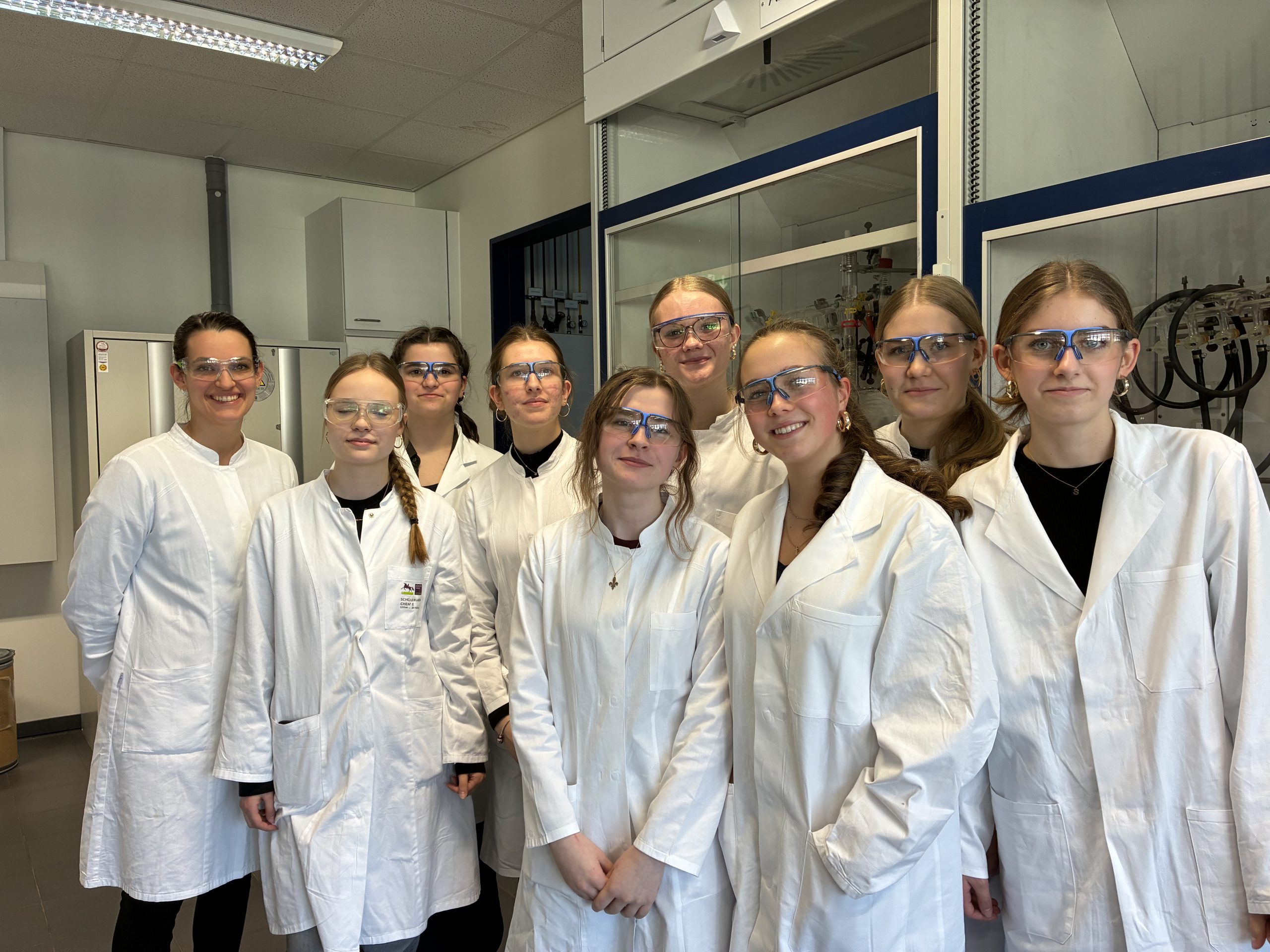 Eine Gruppe von acht Personen in weißen Laborkitteln und Schutzbrillen steht lächelnd zusammen in einem Labor. Im Hintergrund sind Laboreinrichtungen sichtbar.