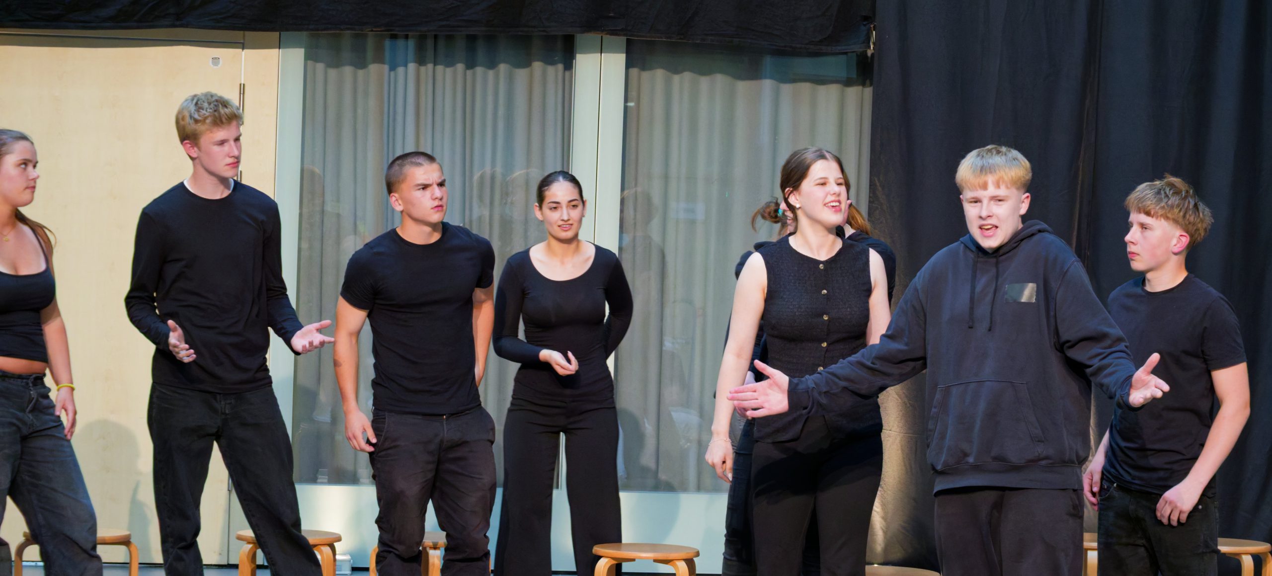 Der Theaterkurs hat sich den Sturm- und Drang Text von Schiller zur Hilfe genommen, um Fragen in den Vordergrund zu stellen: Wie schnell kann man vom Träumer zum Täter werden? Wie leicht kippen Werte, wenn man sich ungesehen, ungerecht behandelt fühlt? Wo endet Moral und wo beginnt das Verbrechen?