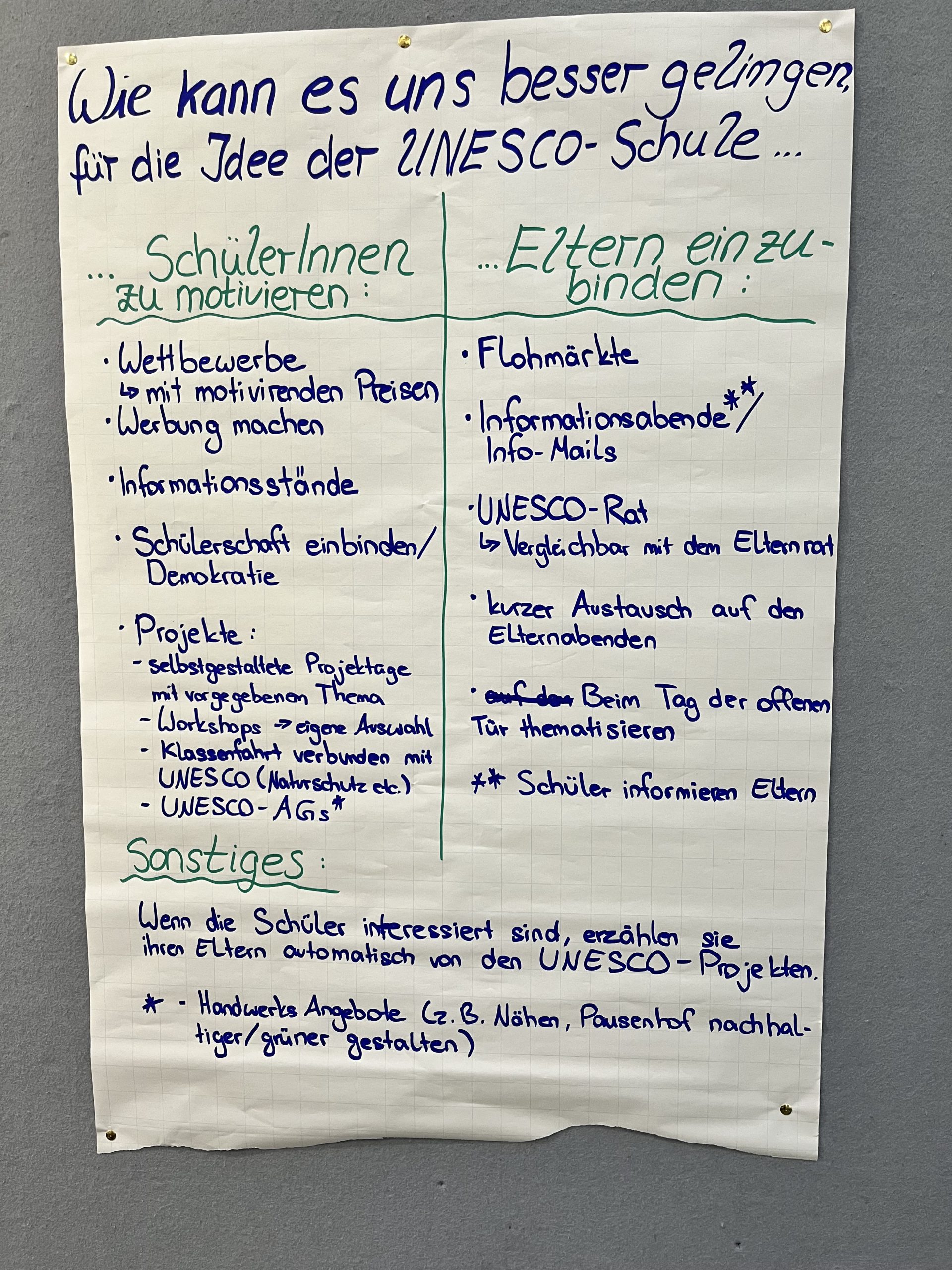 Zum Start des Tages standen Kennenlernspiele auf dem Programm, die schnell für eine lebendige Atmosphäre sorgten. Danach ging es in alters- und schulgemischten Teams an die inhaltliche Arbeit: Im Mittelpunkt stand dabei die Frage, wie sich unsere Schulgemeinschaften noch besser für UNESCO-Themen begeistern ließen. In kleinen Workshops brachten die Schüler*innen ihre Gedanken ein, entwarfen Konzepte und diskutierten neue Möglichkeiten des Engagements. Außerdem gab es Austausch über die Besonderheiten jeder Schule, sodass ein guter Einblick in die Vielfalt der UNESCO-Arbeit an den verschiedenen Schulen entstand. Trotz des Altersunterschieds und der Tatsache, dass man sich gerade erst kennengelernt hatte, arbeiteten alle ziemlich konzentriert und harmonisch zusammen und hielten ihre Ideen und neuen Ansätze auf Plakaten fest.