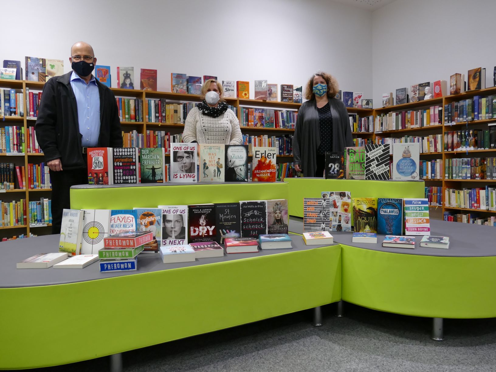 Wie auf dem Foto zu sehen, handelt es sich um eine reiche Auswahl sehr verschiedener Romane, die vor allem für jugendliche Leser im Alter von dreizehn bis siebzehn zu empfehlen sind. Die vielfältigen Themen umfassen spannende Kriminalgeschichten und Thriller (z.B. „One of Us is Lying“/ „One of Us is Next“, „Die Mühle“), Liebe und Liebeskummer (z.B. „Playlist meiner miesen Entscheidungen“, „36 Fragen an dich“), das Auf und Ab beim Erwachsenwerden („Mein Sommer auf dem Mond“), die Liebe zu einem gleichgeschlechtlichen Partner (z.B. „Call Me by Your Name“, „Love, Simon“), Reise-Fiktion („Abgefahren“), Science-Fiction („Pheromon“, „Infernale“), usw.!