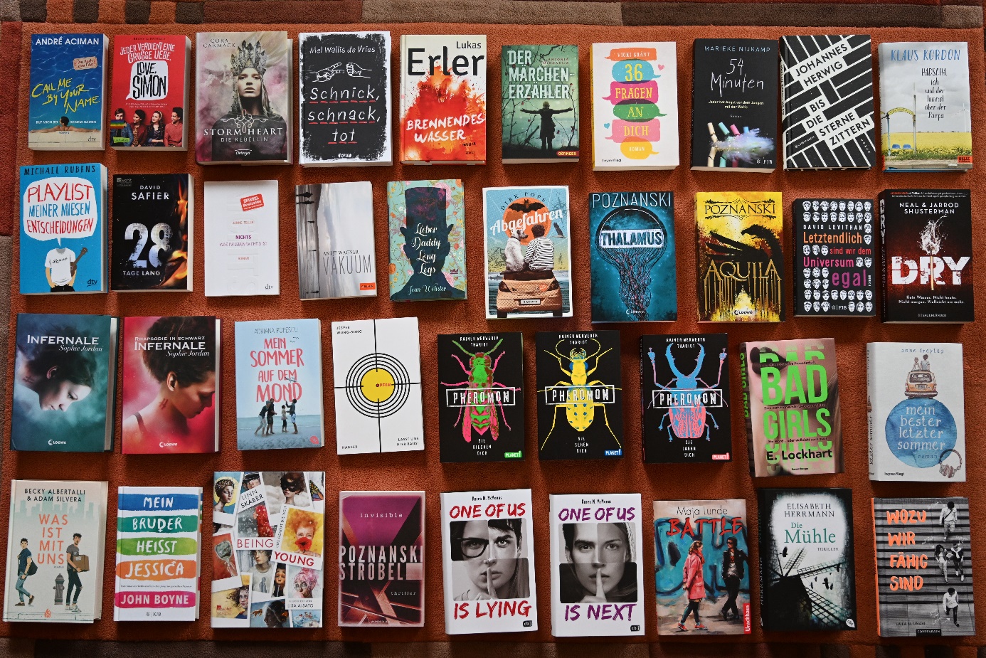Wie auf dem Foto zu sehen, handelt es sich um eine reiche Auswahl sehr verschiedener Romane, die vor allem für jugendliche Leser im Alter von dreizehn bis siebzehn zu empfehlen sind. Die vielfältigen Themen umfassen spannende Kriminalgeschichten und Thriller (z.B. „One of Us is Lying“/ „One of Us is Next“, „Die Mühle“), Liebe und Liebeskummer (z.B. „Playlist meiner miesen Entscheidungen“, „36 Fragen an dich“), das Auf und Ab beim Erwachsenwerden („Mein Sommer auf dem Mond“), die Liebe zu einem gleichgeschlechtlichen Partner (z.B. „Call Me by Your Name“, „Love, Simon“), Reise-Fiktion („Abgefahren“), Science-Fiction („Pheromon“, „Infernale“), usw.!