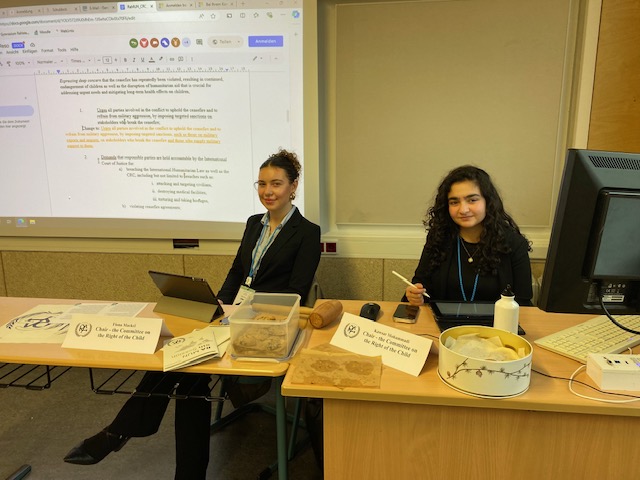 Die beiden Komitees beschäftigten sich mit aktuellen Themen: Children’s Rights in Gaza and Israel sowie Women’s Rights in Iran. Ein besonderer Programmpunkt war die Live-Schalte zu Stéphanie Toschi, Counsellor of Human Rights der luxemburgischen UN-Vertretung in New York. Sie berichtete davon, wie wichtig es gerade in schwierigen globalen Zeiten ist, sich für Politik und Diplomatie zu interessieren – sowohl für Fachleute als auch für junge Menschen.