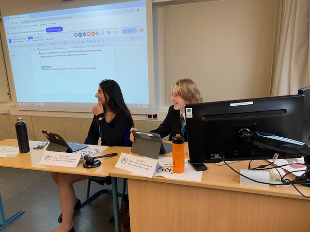 Die beiden Komitees beschäftigten sich mit aktuellen Themen: Children’s Rights in Gaza and Israel sowie Women’s Rights in Iran. Ein besonderer Programmpunkt war die Live-Schalte zu Stéphanie Toschi, Counsellor of Human Rights der luxemburgischen UN-Vertretung in New York. Sie berichtete davon, wie wichtig es gerade in schwierigen globalen Zeiten ist, sich für Politik und Diplomatie zu interessieren – sowohl für Fachleute als auch für junge Menschen.
