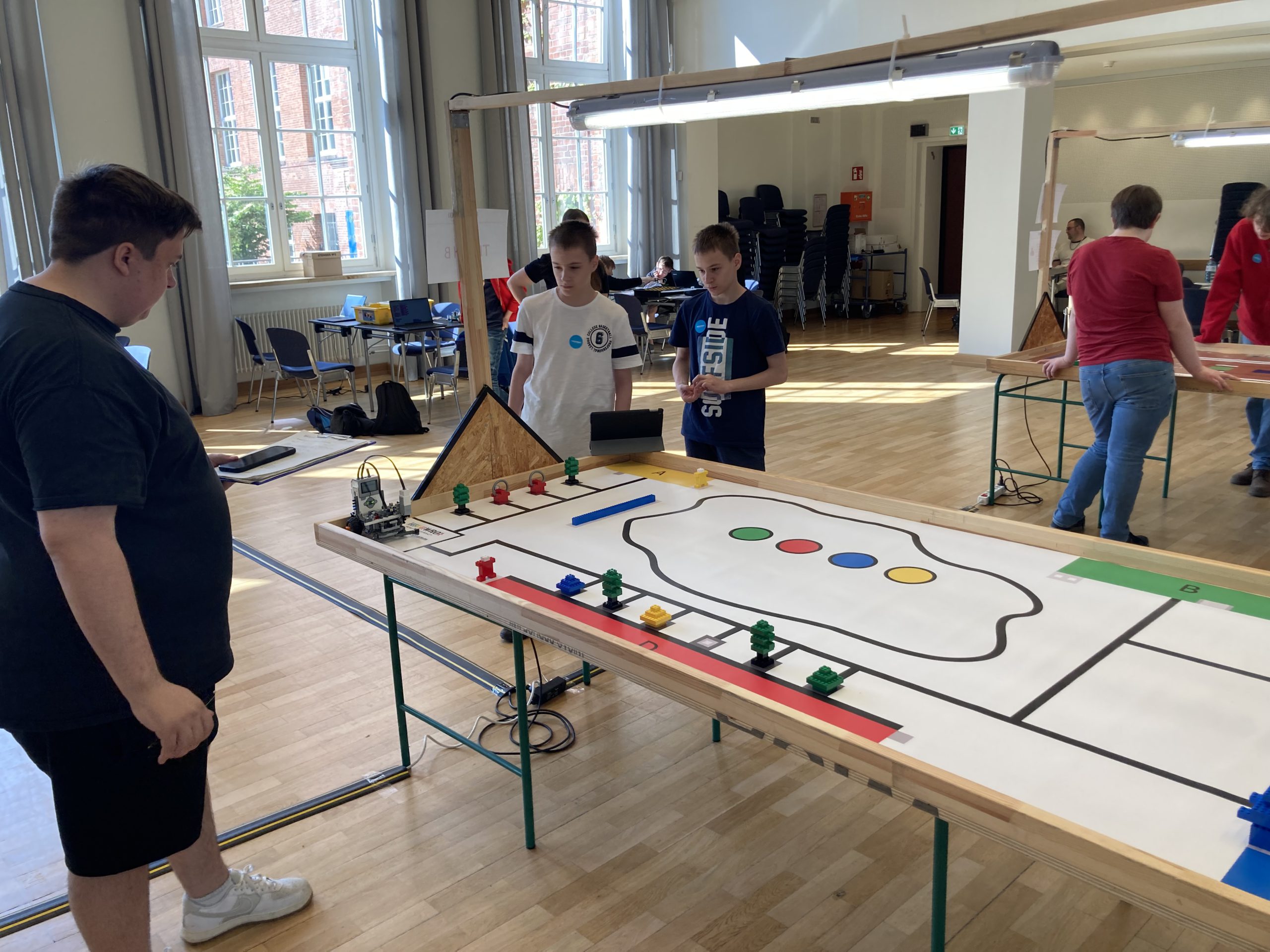 Ein LEGO-Roboter steht auf einer Spielfläche mit einer markierten Strecke. Im Hintergrund ist eine große Box mit bunten Symbolen zu sehen, und ein Schild mit der Aufschrift Zwei junge Menschen stehen vor einem modernen Gebäude mit der Aufschrift Zwei Jugendliche stehen vor dem Gebäude des Gymnasiums Rahlstedt. Der Junge links trägt einen roten Pullover und zeigt mit einer Faust nach oben, während er einen kleinen Gegenstand in der anderen Hand hält. Das Mädchen rechts trägt ein rotes T-Shirt und hält eine Auszeichnung oder einen Preis in der Hand. Beide lächeln und wirken erfreut. Im Hintergrund ist der Eingang des Gymnasiums mit dem Schriftzug „Gymnasium Rahlstedt“ zu sehen. Zwei Jugendliche stehen vor einem Gebäude mit der Aufschrift Drei Jugendliche stehen um einen großen Tisch mit einem Spielbrett, das eine farbige Strecke und verschiedene Spielsteine zeigt. Sie betrachten einen Laptop oder ein Tablet, während ein weiterer Jugendlicher im Hintergrund an einem anderen Tisch arbeitet. Der Raum hat große Fenster mit Tageslicht und eine helle Holzfußboden. Drei Personen arbeiten an einem großen, rechteckigen Tisch, der mit einer farbigen, gezeichneten Spielfläche ausgestattet ist. Auf dem Tisch befinden sich verschiedene Objekte und Roboter, die für ein Projekt oder einen Wettbewerb verwendet werden. Im Hintergrund sind weitere Personen und Tische zu sehen, die auf eine aktive Lernumgebung hinweisen. Das Licht fällt durch große Fenster und schafft eine helle Atmosphäre im Raum. Zwei Jungen arbeiten an einem großen Tisch in einem hellen Raum, der mit Fenstern ausgestattet ist. Der eine Junge steht und beobachtet, während der andere Junge sich über eine markierte Fläche mit verschiedenen bunten Formen beugt, die wie ein Spiel oder ein Lernprojekt aussieht. Im Hintergrund sind weitere Personen und Tische zu sehen. Zwei Jugendliche stehen an einem Tisch, auf dem ein Roboter und eine farbige Strecke platziert sind. Der ältere Junge hält ein Tablet in der Hand, während der jüngere Junge auf den Tisch schaut. Im Hintergrund sind weitere Personen und ein Bildschirm sichtbar. Zwei Jungen sitzen an einem Tisch in einem Raum mit gestapelten Stühlen im Hintergrund. Auf dem Tisch befinden sich zwei Tablets, einige Dokumente und ein kleiner Behälter. Die Jungen schauen in die Kamera und scheinen an einem Projekt oder einer Aktivität beteiligt zu sein. Ein Tisch in einem großen Raum mit Holzfußboden. Auf dem Tisch befindet sich ein Spielfeld mit einer gezeichneten Strecke, die von verschiedenen bunten Figuren (Rot, Blau, Gelb, Grün) umrandet ist. Eine Beschilderung mit der Aufschrift Ein heller, moderner Veranstaltungsraum mit Holzfußboden. An der Vorderwand befindet sich eine große Leinwand mit der Aufschrift Ein Blatt Papier auf einem Tisch mit dem Titel