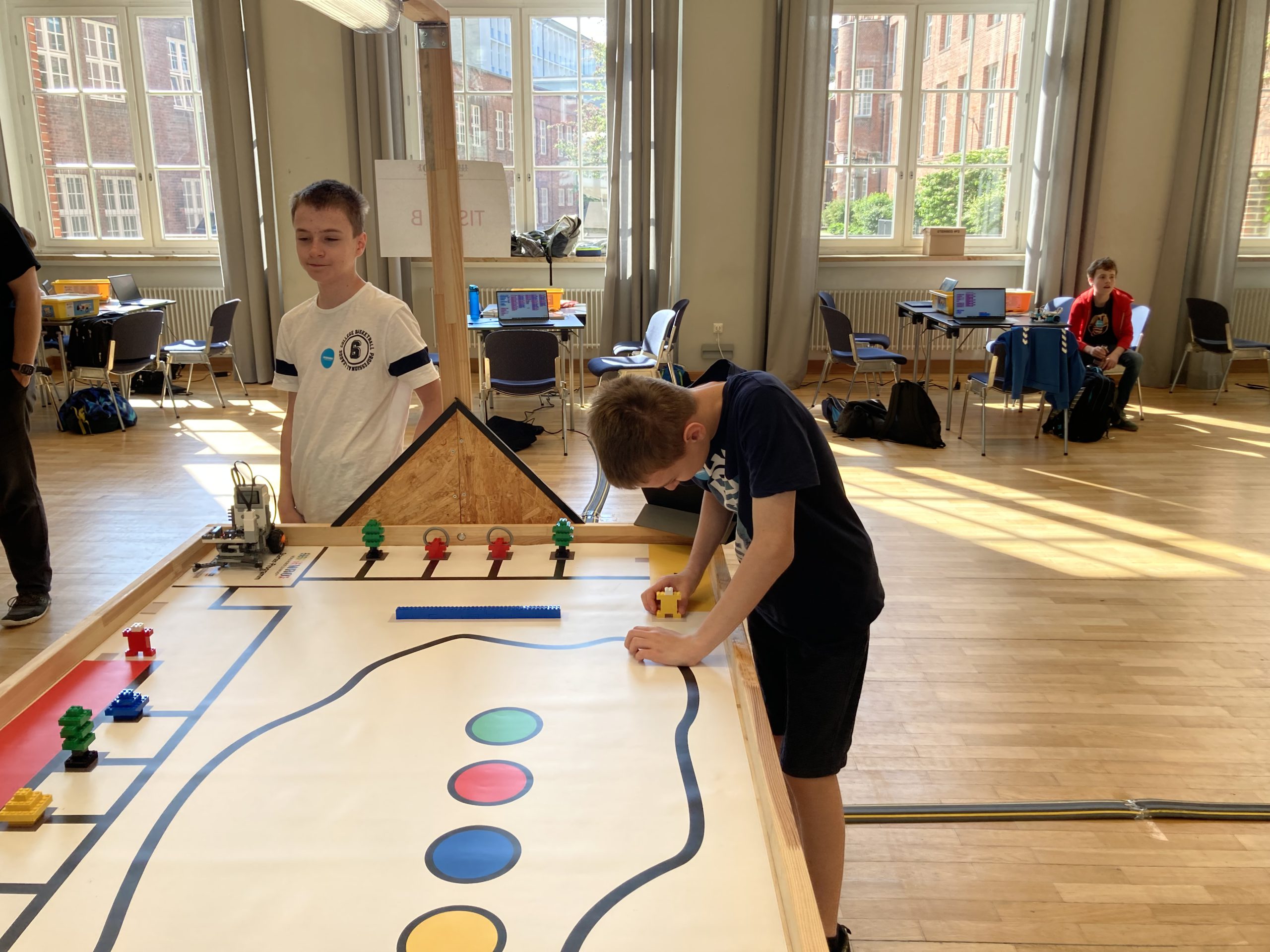 Am letzten Schultag vor den Maiferien fehlten die Schüler der Robotik-Profi-AG: Sie waren am frühen Morgen bereits zur Hochschule für Angewandte Wissenschaften (HAW) gereist, um an der „World Robot Olympiad“ (WRO) teilzunehmen. Wie schon im vergangenen Jahr hatten sich in der AG zwei Teams gebildet, die am „Starter Programm“ der WRO teilnahmen. Dabei muss ein im Laufe des Schuljahres entwickelter Lego-Roboter in einem Parcours mehrere Aufgaben autonom erledigen. Eine zusätzliche Aufgabe bekommen die Teams erst am Tag des Wettbewerbs und versuchen, diese in ca. 90 Minuten zusätzlich zu programmieren. Unsere Teams bestanden aus Emil (6b) und Paul (6f) sowie Julian (6d), Linus (7c) und Nicolas (7c). In diesem Wettbewerb erhalten alle Teams eine Urkunde mit einem Rang entsprechend der Anzahl der gelösten Aufgaben. Alle unsere Teams haben den Rang „Fortgeschrittener“ erreicht. In diesem Jahr waren einige sehr erfolgreiche Teams von anderen Schulen dabei, was den Tag zu einem schönen Erlebnis gemacht hat, gerade auch wegen des Austausches mit Schülerinnen und Schülern von anderen Schulen: