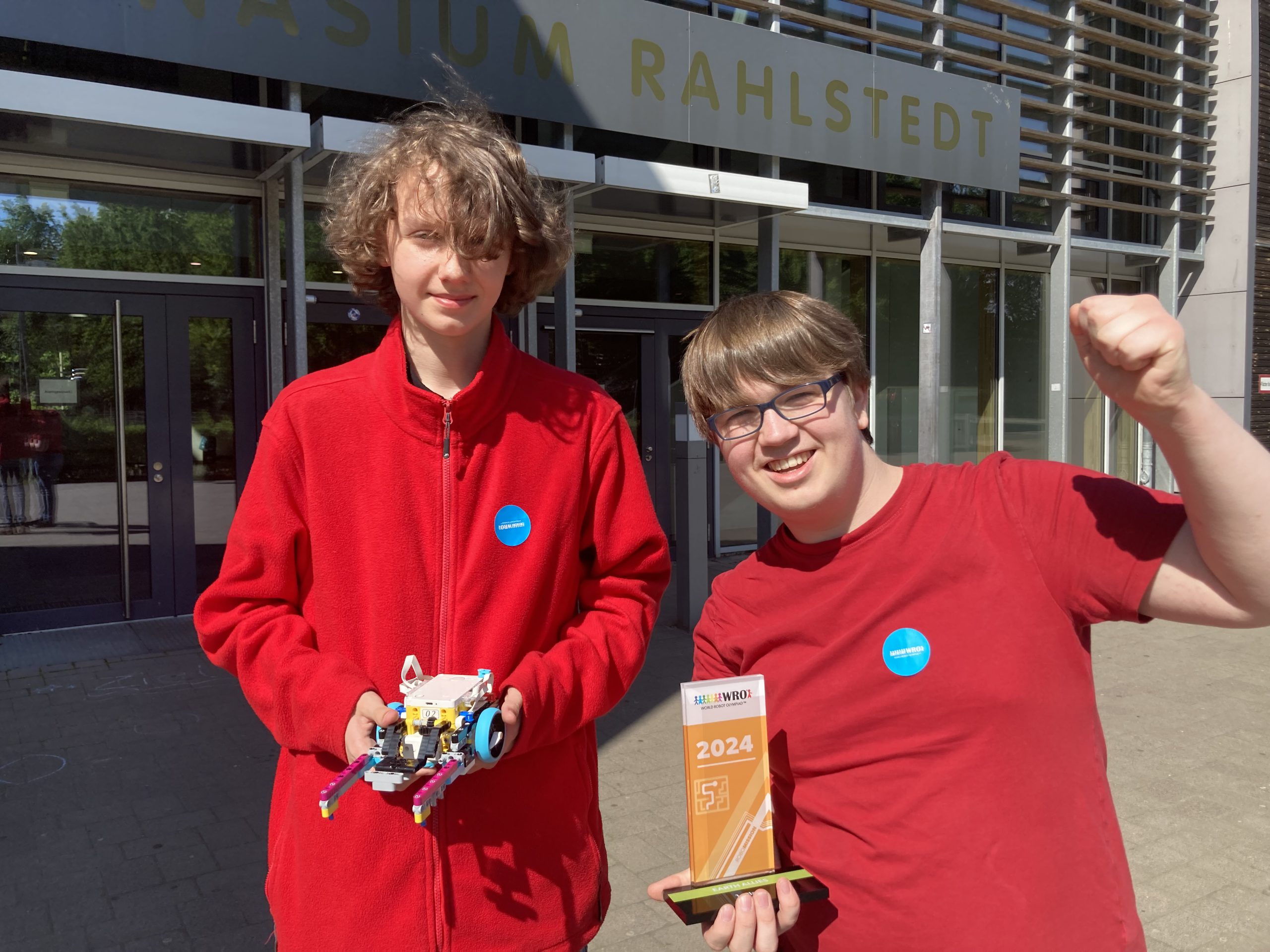 Zwei Jugendliche stehen vor dem Gebäude des Gymnasiums Rahlstedt. Der Junge links trägt einen roten Pullover und zeigt mit einer Faust nach oben, während er einen kleinen Gegenstand in der anderen Hand hält. Das Mädchen rechts trägt ein rotes T-Shirt und hält eine Auszeichnung oder einen Preis in der Hand. Beide lächeln und wirken erfreut. Im Hintergrund ist der Eingang des Gymnasiums mit dem Schriftzug „Gymnasium Rahlstedt“ zu sehen.