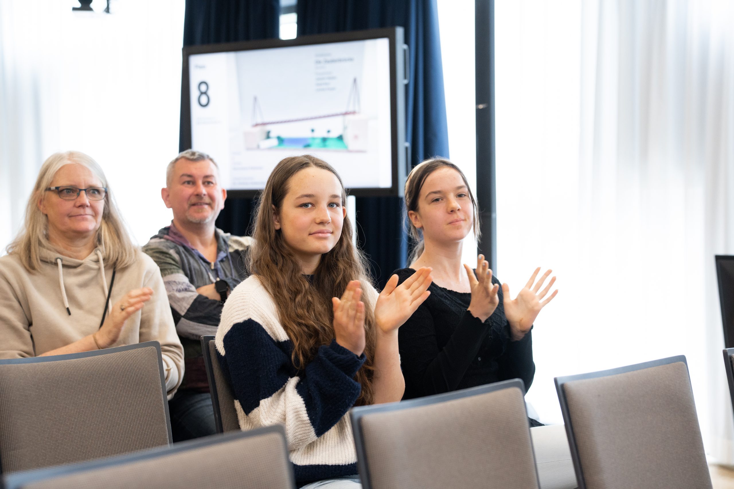 Eine Gruppe von Menschen sitzt in einem Raum und applaudiert. Im Vordergrund sind zwei junge Frauen zu sehen, die begeistert klatschen. Im Hintergrund sind weitere Personen und ein Präsentationsbildschirm sichtbar. Die Atmosphäre wirkt positiv und unterstützend.
