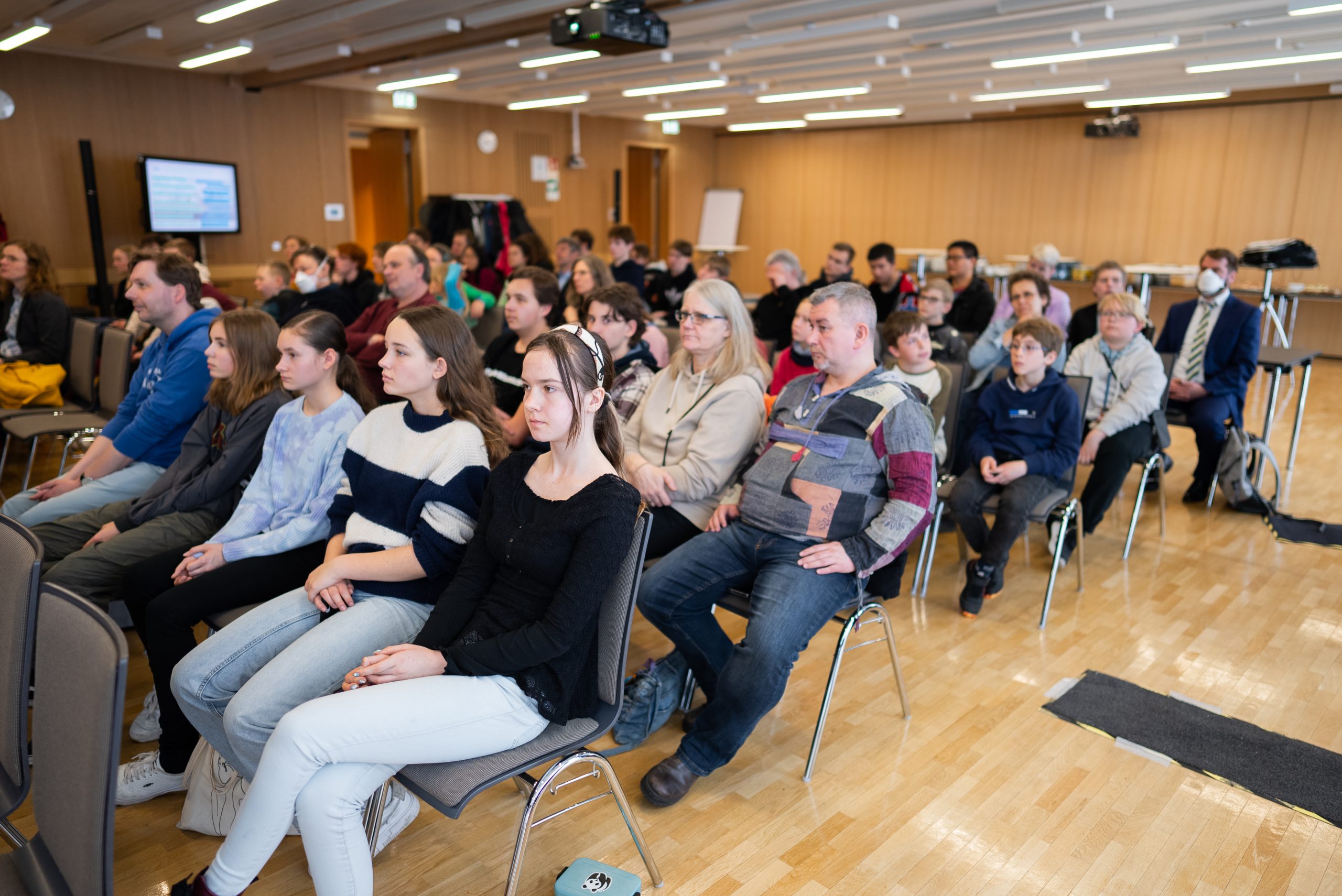 Eine Gruppe von Menschen sitzt in einem Raum in Reihen auf Stühlen. Die Anwesenden sind unterschiedlichen Alters und scheinen einem Vortrag oder einer Präsentation zuzuhören. Im Hintergrund sind weitere Personen und ein Bildschirm sichtbar. Der Raum hat eine helle Holzfußboden und eine moderne, freundliche Atmosphäre.Wir warten gespannt auf die Preisverleihung.