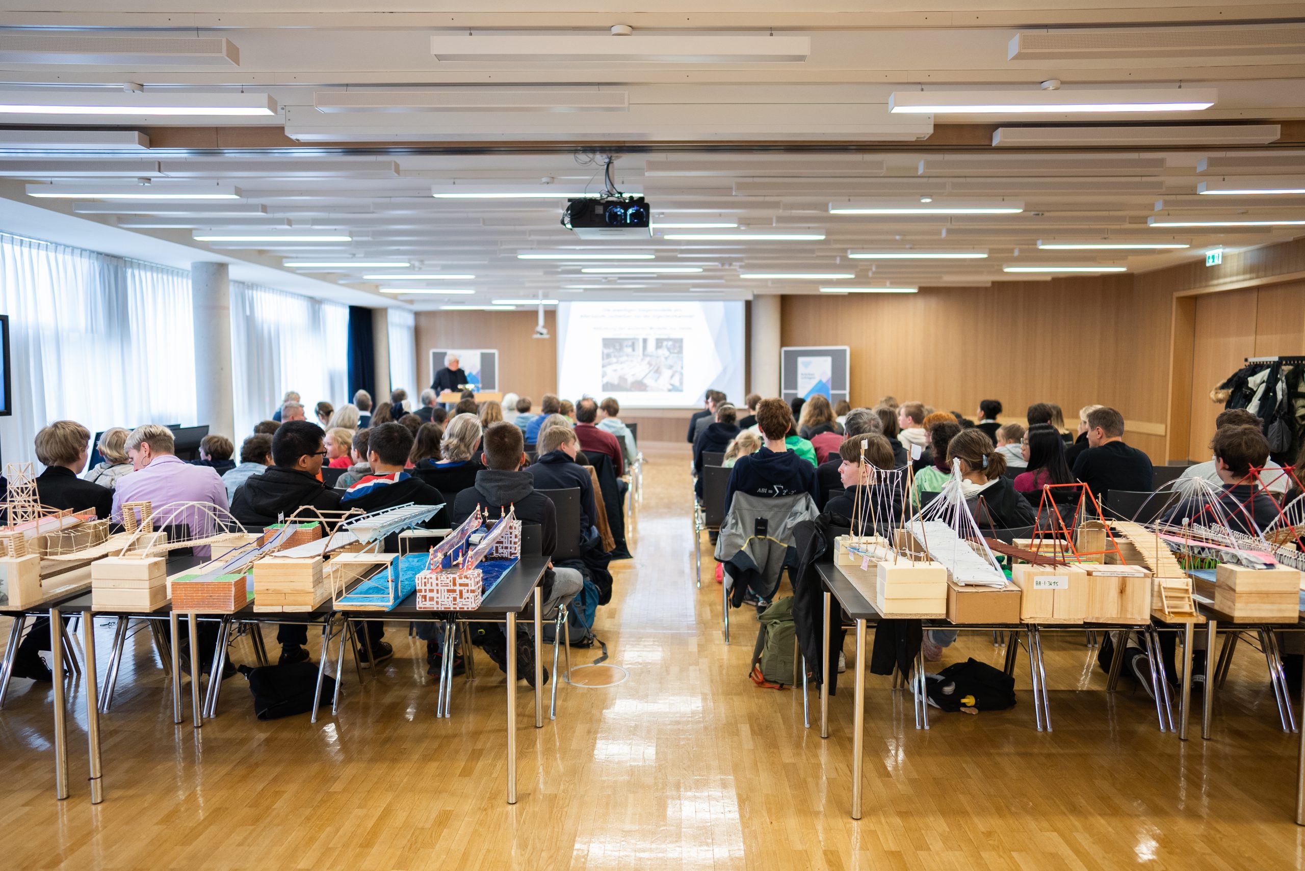 Ein großer Raum mit zahlreichen Personen, die in Reihen sitzen und auf eine Präsentation an der Vorderseite des Raumes schauen. Auf den Tischen vor den Sitzenden sind verschiedene Materialien oder Modelle ausgelegt. Es gibt Fenster, die Tageslicht hereinlassen, und eine Leinwand, auf der Informationen angezeigt werden. Die Atmosphäre wirkt informativ und engagiert.Modell einer Brücke aus Holz mit feinen Seilen und einer blauen Plattform, im Vordergrund stehen einige Personen, die zuschauen, im Hintergrund ist ein weiterer Mann zu sehen, der an einem Stativ arbeitet.Bericht: Andreas Gedaschko