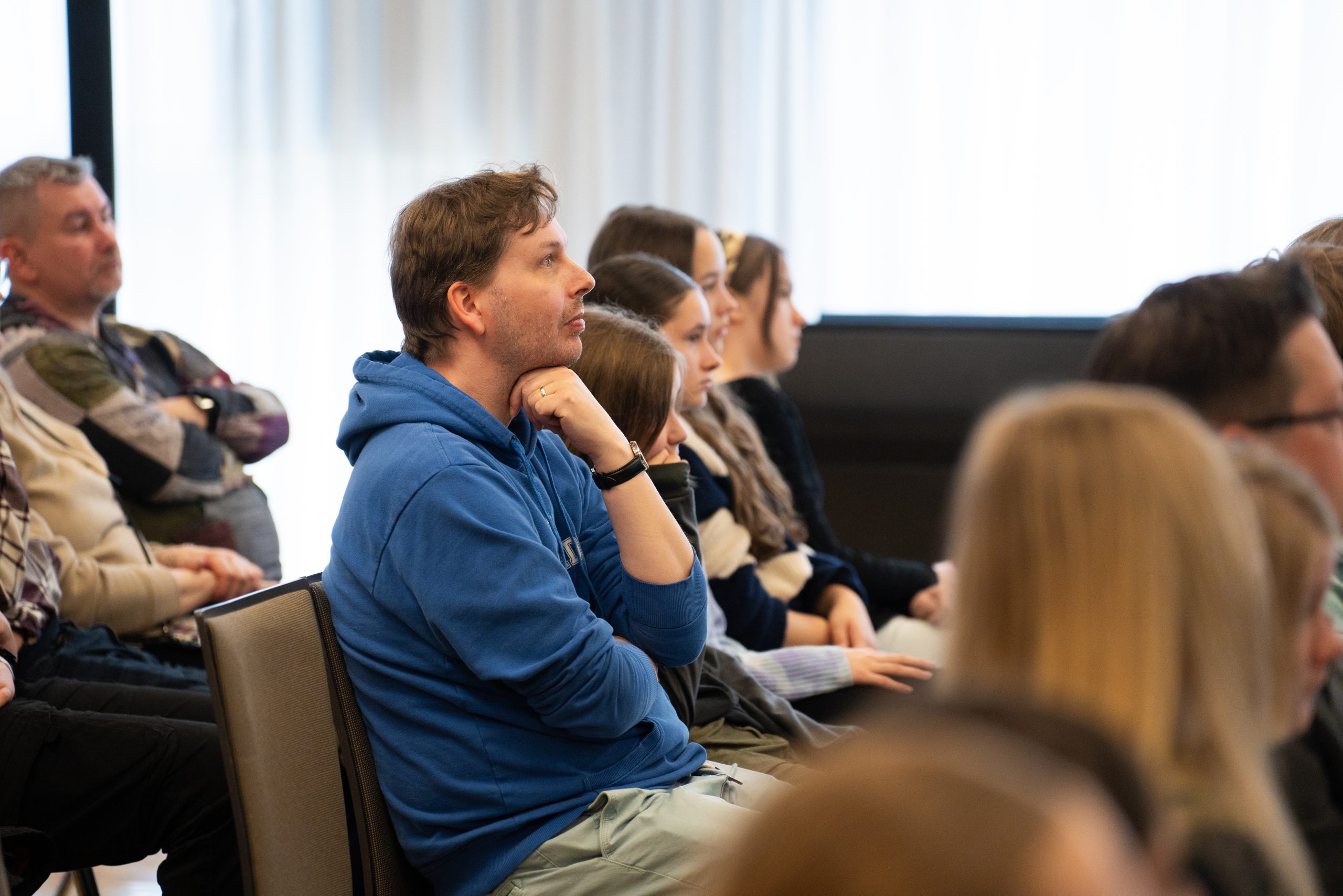 Eine Gruppe von Menschen sitzt in einem Raum und hört aufmerksam zu. Im Vordergrund ist ein Mann in einem blauen Hoodie zu sehen, der nachdenklich wirkt. Im Hintergrund sind weitere Personen zu erkennen, die ebenfalls in die Richtung der Präsentation schauen. Der Raum hat große Fenster mit viel Tageslicht.