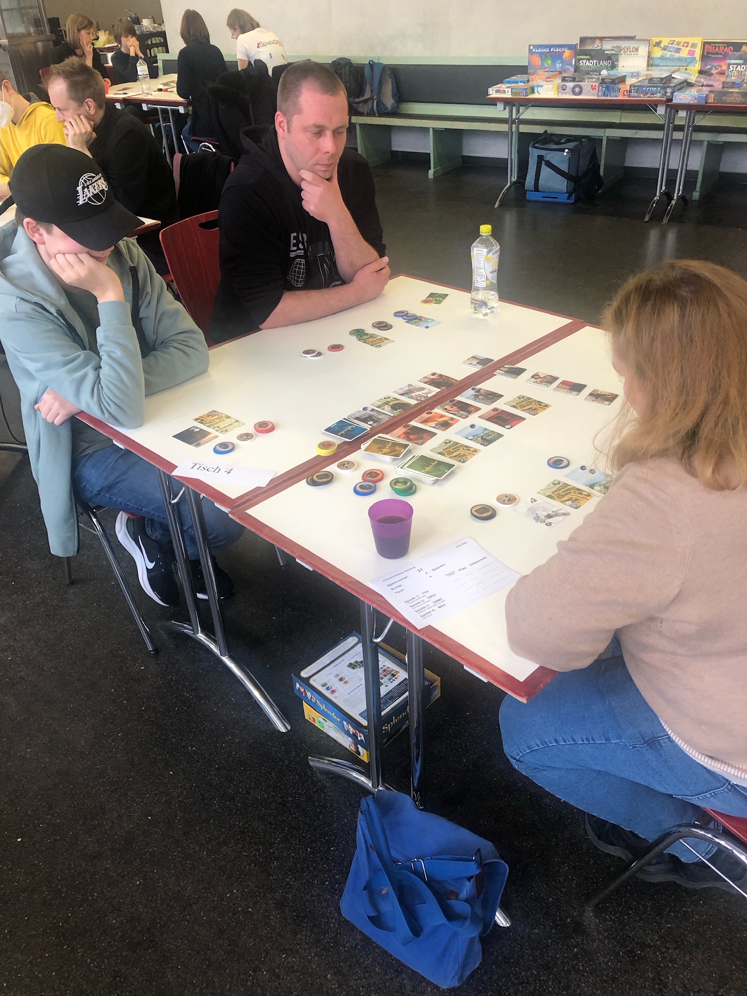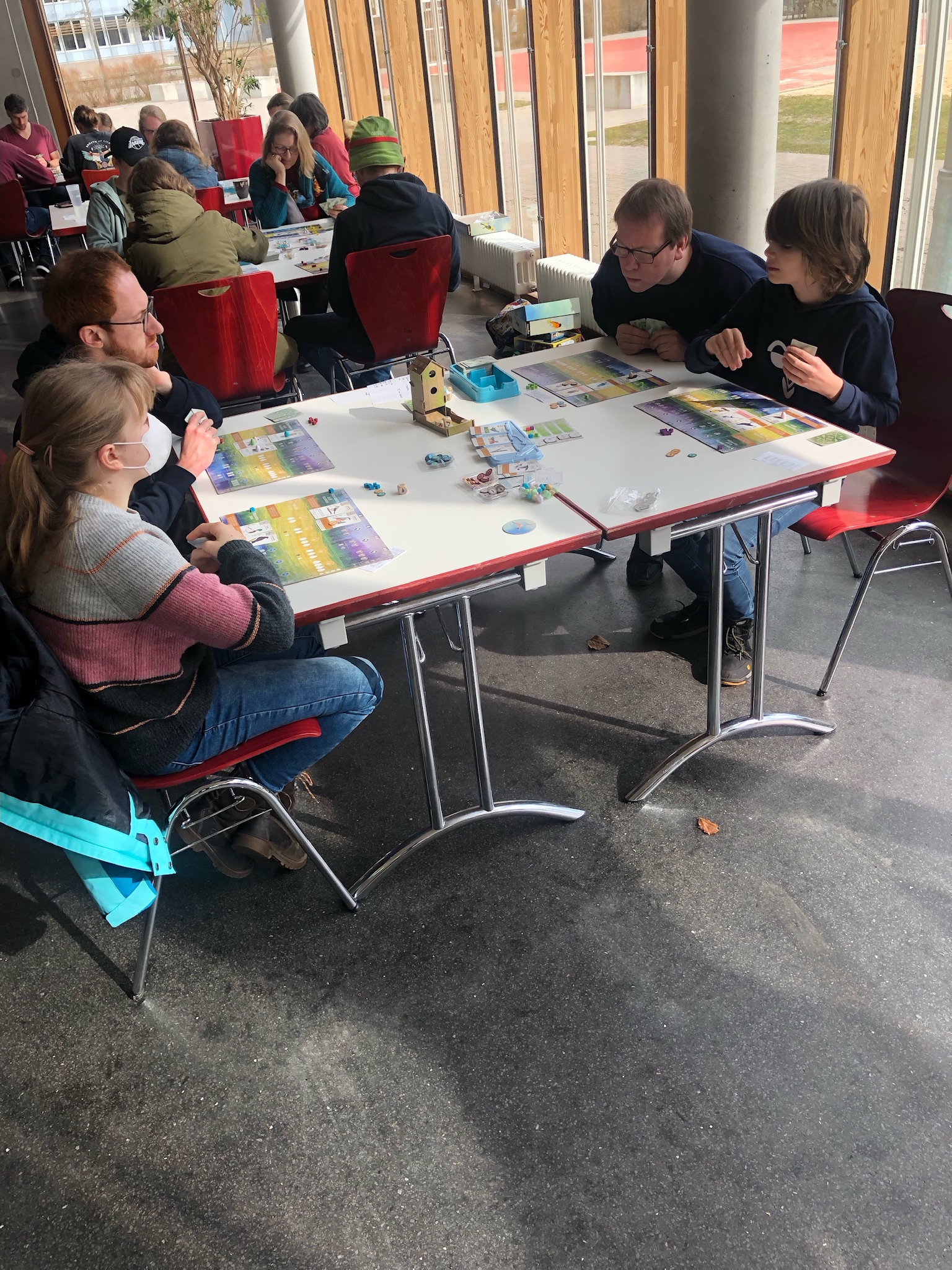 Vier Personen sitzen an einem Tisch in einem hellen Raum mit großen Fenstern. Sie spielen ein Brettspiel und haben verschiedene Spielmaterialien vor sich ausgebreitet. Zwei Personen, ein Mann und eine Frau, sitzen gegenüber, während zwei weitere Personen, ein Mann und ein Junge, auf der anderen Seite des Tisches sitzen. Im Hintergrund sind weitere Tische und Menschen zu sehen.