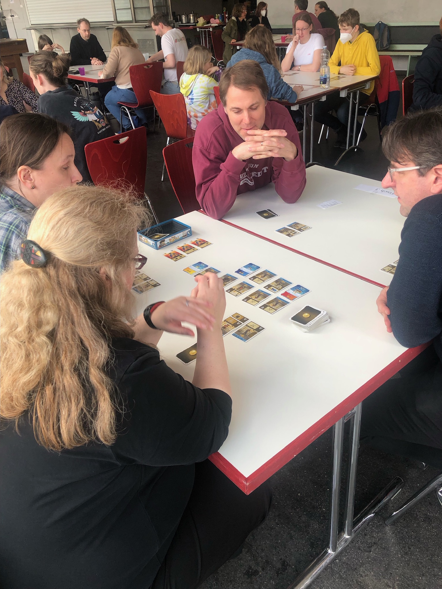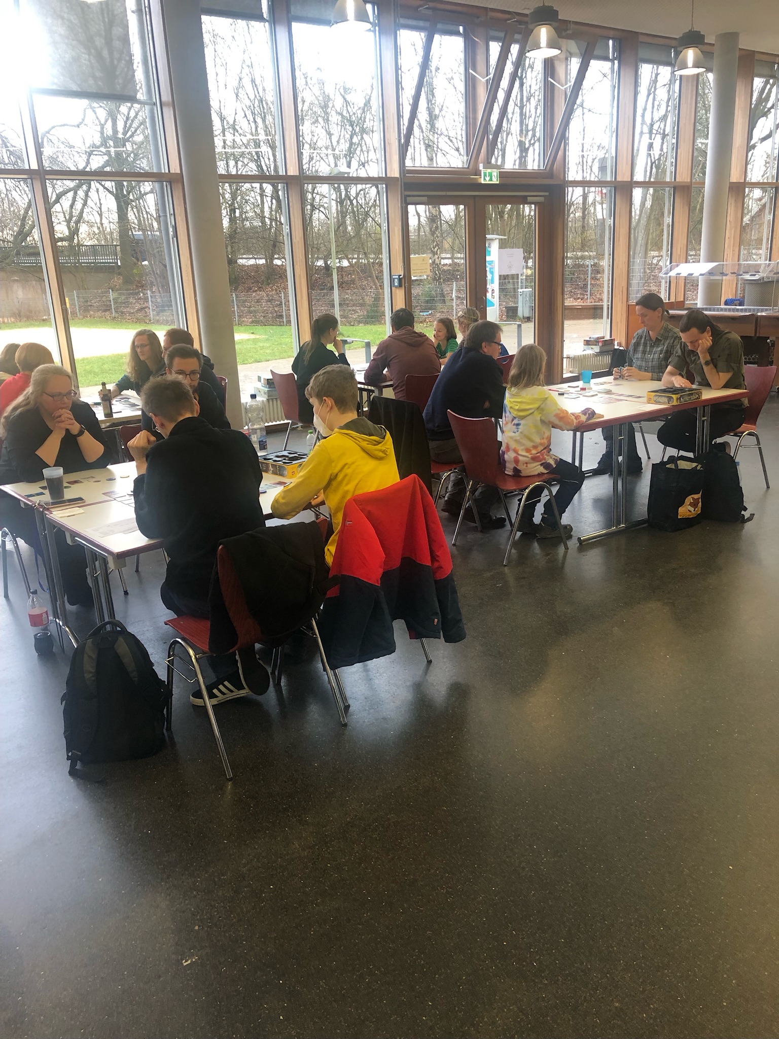 Vier Personen sitzen an einem Tisch in einem hellen Raum mit großen Fenstern. Sie spielen ein Brettspiel und haben verschiedene Spielmaterialien vor sich ausgebreitet. Zwei Personen, ein Mann und eine Frau, sitzen gegenüber, während zwei weitere Personen, ein Mann und ein Junge, auf der anderen Seite des Tisches sitzen. Im Hintergrund sind weitere Tische und Menschen zu sehen.
