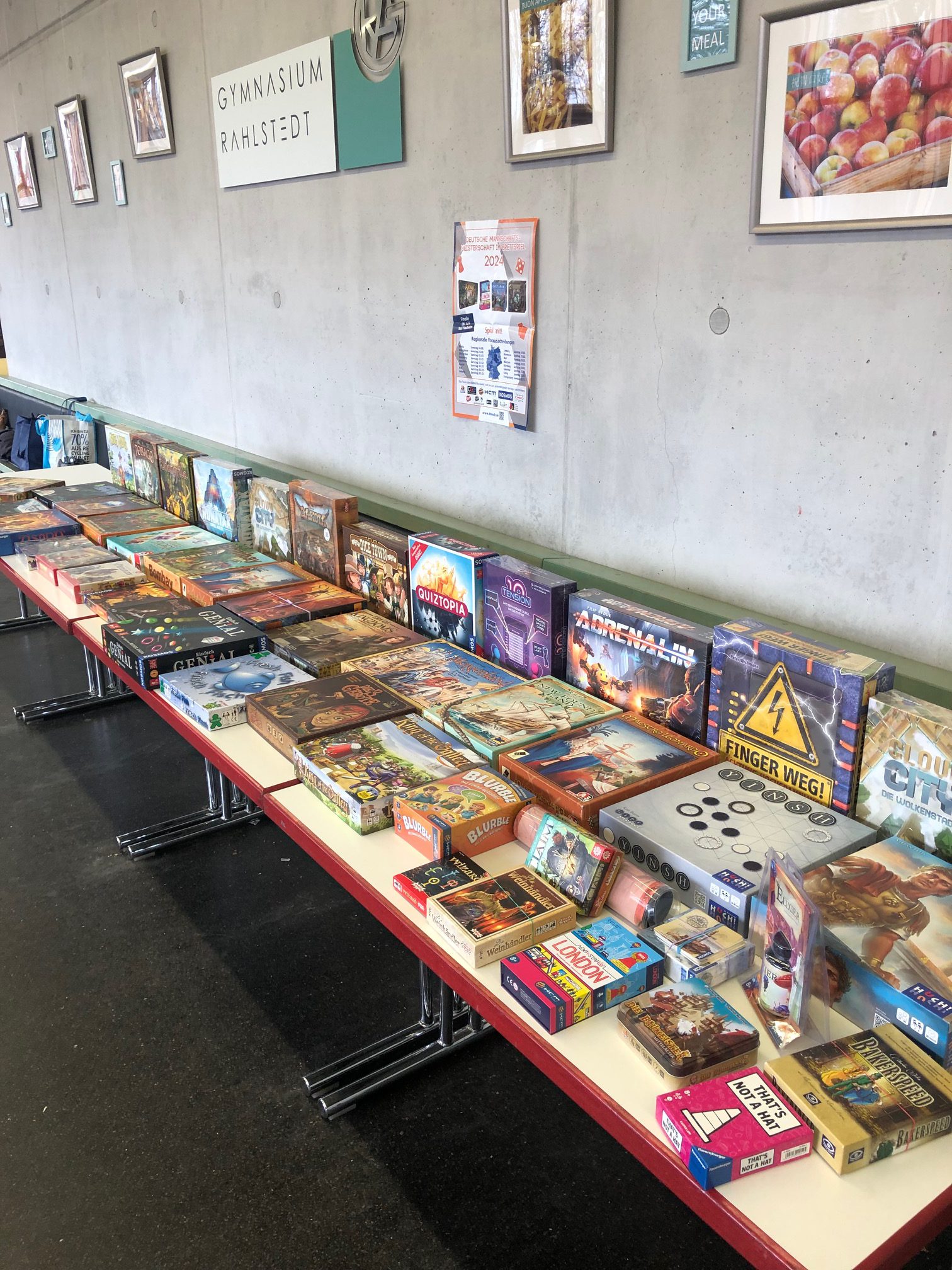 Eine Gruppe von acht Personen steht in einem Raum vor einer Wand mit dem Schild "GYMNASIUM RAHNSTEDT". Sie halten verschiedene Brettspiele in den Händen. Die Gruppe besteht aus Erwachsenen und Kindern, die unterschiedlichen Alters und Geschlechts sind. Im Hintergrund sind einige Bilder an der Wand zu sehen. Die Atmosphäre wirkt freundlich und einladend.