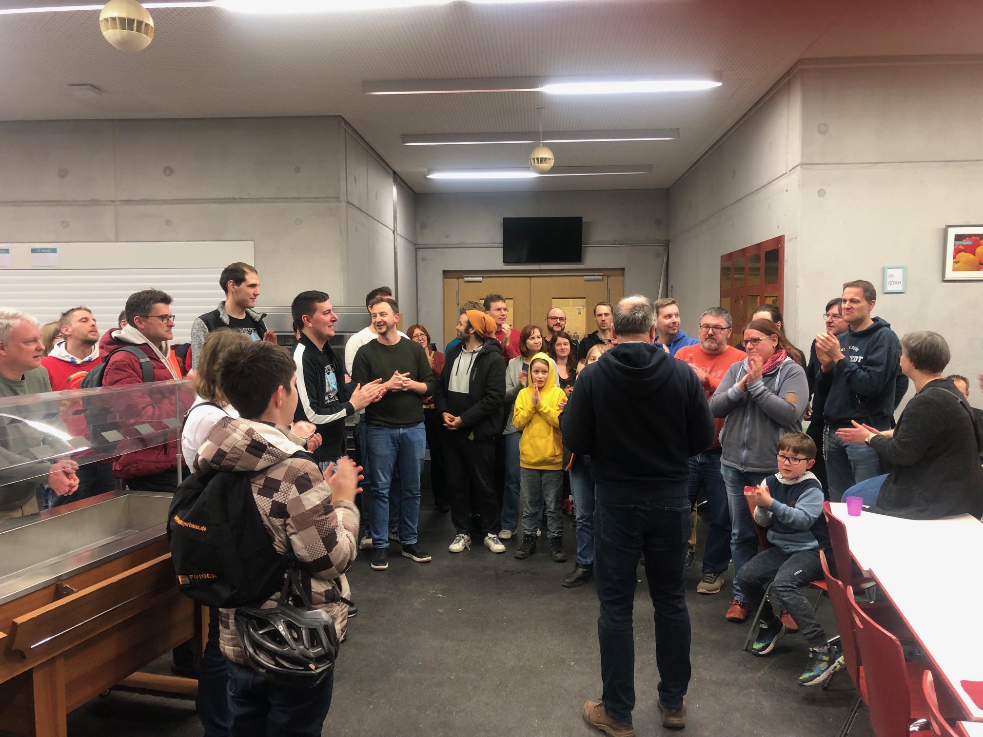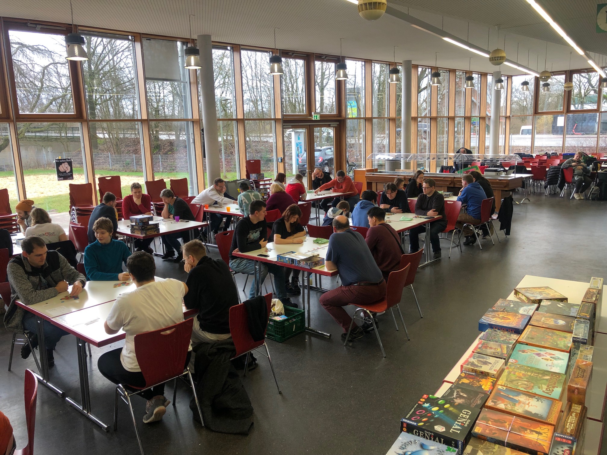 Eine Gruppe von Menschen versammelt sich in einem Raum. Im Vordergrund steht ein Mann, der spricht, während die anderen applaudieren. Die Anwesenden sind unterschiedlich gekleidet und zeigen diverses Alter. Der Raum hat eine moderne Atmosphäre mit Wänden aus Beton und einigen Fenstern im Hintergrund. Zwei Personen sitzen an einem Tisch, der mit verschiedenen Spielkarten und einem Spielbrett bedeckt ist. Im Hintergrund sind weitere Personen zu sehen, die ebenfalls an Tischen sitzen. Die Umgebung wirkt freundlich und gesellig, und es sind Getränke auf dem Tisch vorhanden. Eine Gruppe von Menschen sitzt an Tischen in einem hellen Raum mit großen Fenstern. Einige Personen lesen oder arbeiten an Projekten, während andere miteinander sprechen. Die Tische sind mit verschiedenen Materialien und Gegenständen bedeckt. Im Hintergrund sind rote Stühle gestapelt zu sehen. Eine Gruppe von Personen sitzt an Tischen in einem Raum, der für soziale Aktivitäten genutzt wird. Einige Teilnehmer sind beschäftigt, Karten oder Spielmaterialien zu betrachten, während andere miteinander sprechen. Die Umgebung ist hell und freundlich, mit Stühlen in verschiedenen Farben. Eine Gruppe von Menschen sitzt an Tischen in einem hellen Raum mit großen Fenstern. Sie sind mit verschiedenen Aktivitäten beschäftigt, während einige auf Papiere oder Materialien schauen. Die Tische sind mit Stühlen in Rot und Silber ausgestattet. Im Hintergrund sind weitere Personen sichtbar, die ebenfalls an den Tischen arbeiten. Ein Tisch mit verschiedenen Speisen und Snacks. Darunter sind Salate, Wurstwaren, Gebäck, Früchte und Desserts in verschiedenen Schalen und Platten angerichtet. Einige Schalen sind mit Beschriftungen versehen. Im Hintergrund sind bunte Becher zu sehen. Ein Tisch mit einer Vielzahl von Brettspielen ist in einem Raum aufgestellt. Im Hintergrund sind an einer Betonwand verschiedene Bilder und Schilder angebracht, darunter ein Schild mit der Aufschrift Eine Gruppen von Menschen sitzt an Tischen in einem hellen Raum mit großen Fenstern, die auf eine grüne Außenansicht blicken. Auf den Tischen liegen verschiedene Spiele. Die Atmosphäre wirkt gesellig und einladend, während die Teilnehmer sich unterhalten und miteinander interagieren. Eine Gruppe von Menschen sitzt an Tischen in einem großen Raum. Die Teilnehmer sind in konzentrierter Unterhaltung oder beim Spielen von Brettspielen. Der Raum hat große Fenster, die viel Tageslicht hereinlassen, und im Hintergrund sind weitere Tische und Stühle zu sehen.
