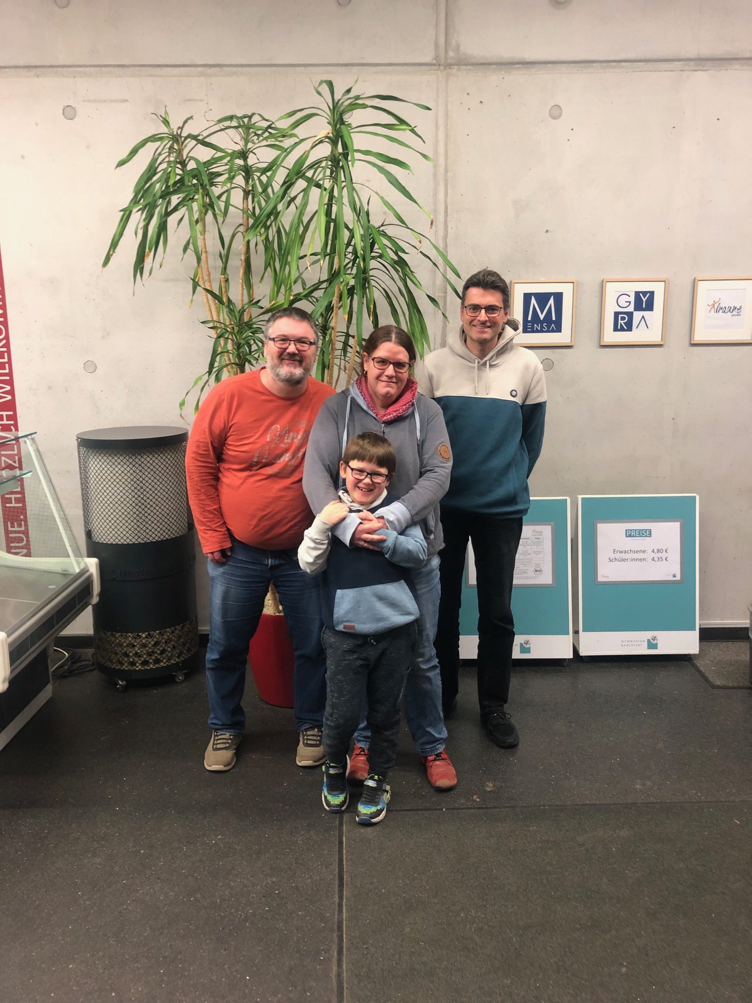 Eine Gruppe von vier Personen steht in einem modernen Innenraum. Im Vordergrund ist ein Kind zu sehen, das in der Mitte steht und von zwei Erwachsenen umarmt wird. Die Erwachsenen sind lächelnd, einer trägt ein oranges Oberteil und der andere ein graues Oberteil. Im Hintergrund steht eine große Pflanze sowie einige Informationsschilder an der Wand. Der Boden ist grau und der Raum wirkt hell und einladend.