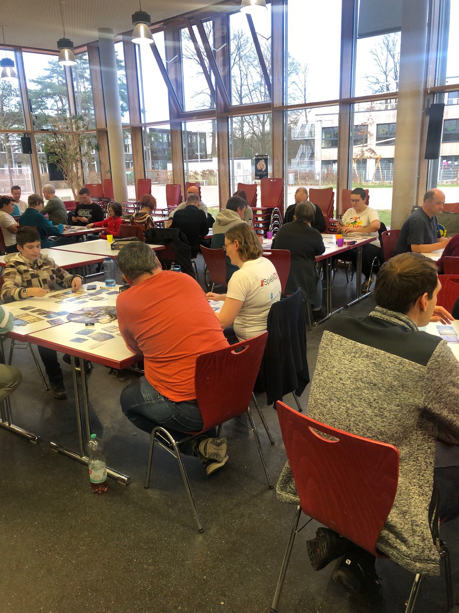 Eine Gruppe von Menschen versammelt sich in einem Raum. Im Vordergrund steht ein Mann, der spricht, während die anderen applaudieren. Die Anwesenden sind unterschiedlich gekleidet und zeigen diverses Alter. Der Raum hat eine moderne Atmosphäre mit Wänden aus Beton und einigen Fenstern im Hintergrund. Zwei Personen sitzen an einem Tisch, der mit verschiedenen Spielkarten und einem Spielbrett bedeckt ist. Im Hintergrund sind weitere Personen zu sehen, die ebenfalls an Tischen sitzen. Die Umgebung wirkt freundlich und gesellig, und es sind Getränke auf dem Tisch vorhanden. Eine Gruppe von Menschen sitzt an Tischen in einem hellen Raum mit großen Fenstern. Einige Personen lesen oder arbeiten an Projekten, während andere miteinander sprechen. Die Tische sind mit verschiedenen Materialien und Gegenständen bedeckt. Im Hintergrund sind rote Stühle gestapelt zu sehen. Eine Gruppe von Personen sitzt an Tischen in einem Raum, der für soziale Aktivitäten genutzt wird. Einige Teilnehmer sind beschäftigt, Karten oder Spielmaterialien zu betrachten, während andere miteinander sprechen. Die Umgebung ist hell und freundlich, mit Stühlen in verschiedenen Farben. Eine Gruppe von Menschen sitzt an Tischen in einem hellen Raum mit großen Fenstern. Sie sind mit verschiedenen Aktivitäten beschäftigt, während einige auf Papiere oder Materialien schauen. Die Tische sind mit Stühlen in Rot und Silber ausgestattet. Im Hintergrund sind weitere Personen sichtbar, die ebenfalls an den Tischen arbeiten. Ein Tisch mit verschiedenen Speisen und Snacks. Darunter sind Salate, Wurstwaren, Gebäck, Früchte und Desserts in verschiedenen Schalen und Platten angerichtet. Einige Schalen sind mit Beschriftungen versehen. Im Hintergrund sind bunte Becher zu sehen. Ein Tisch mit einer Vielzahl von Brettspielen ist in einem Raum aufgestellt. Im Hintergrund sind an einer Betonwand verschiedene Bilder und Schilder angebracht, darunter ein Schild mit der Aufschrift Eine Gruppen von Menschen sitzt an Tischen in einem hellen Raum mit großen Fenstern, die auf eine grüne Außenansicht blicken. Auf den Tischen liegen verschiedene Spiele. Die Atmosphäre wirkt gesellig und einladend, während die Teilnehmer sich unterhalten und miteinander interagieren. Eine Gruppe von Menschen sitzt an Tischen in einem großen Raum. Die Teilnehmer sind in konzentrierter Unterhaltung oder beim Spielen von Brettspielen. Der Raum hat große Fenster, die viel Tageslicht hereinlassen, und im Hintergrund sind weitere Tische und Stühle zu sehen.
