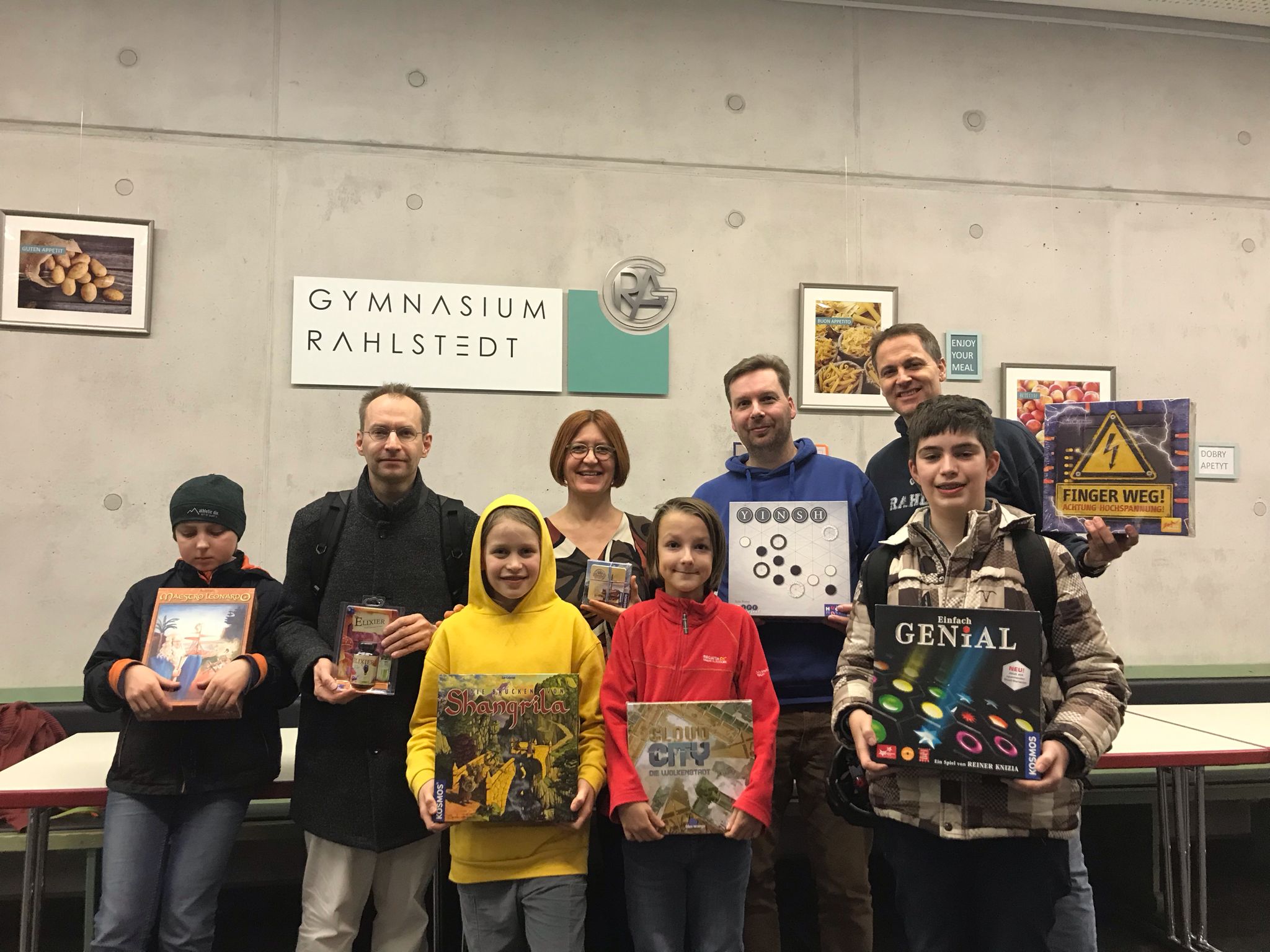 Eine Gruppe von acht Personen steht in einem Raum vor einer Wand mit dem Schild "GYMNASIUM RAHNSTEDT". Sie halten verschiedene Brettspiele in den Händen. Die Gruppe besteht aus Erwachsenen und Kindern, die unterschiedlichen Alters und Geschlechts sind. Im Hintergrund sind einige Bilder an der Wand zu sehen. Die Atmosphäre wirkt freundlich und einladend.