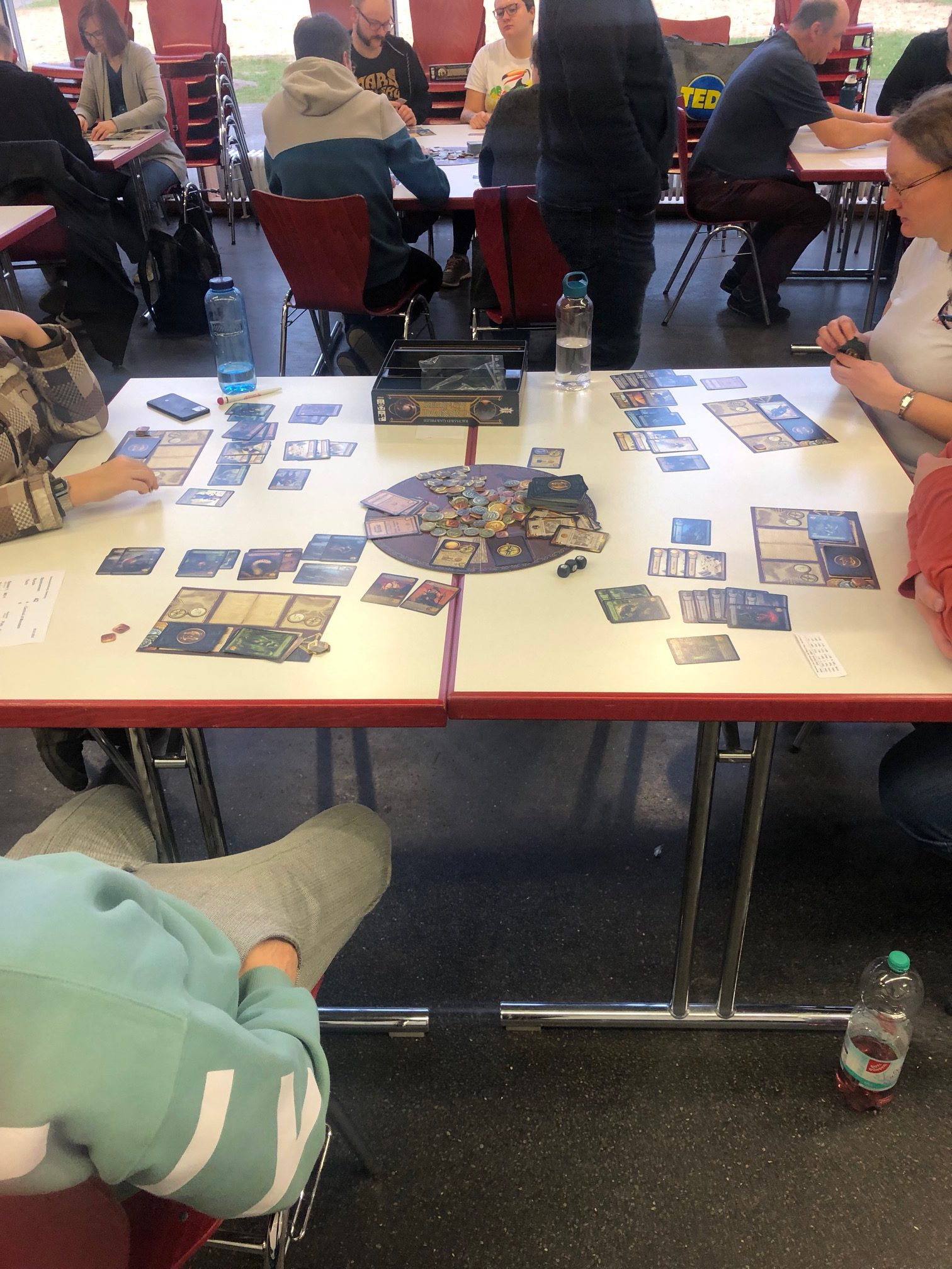 Eine Gruppe von Menschen versammelt sich in einem Raum. Im Vordergrund steht ein Mann, der spricht, während die anderen applaudieren. Die Anwesenden sind unterschiedlich gekleidet und zeigen diverses Alter. Der Raum hat eine moderne Atmosphäre mit Wänden aus Beton und einigen Fenstern im Hintergrund. Zwei Personen sitzen an einem Tisch, der mit verschiedenen Spielkarten und einem Spielbrett bedeckt ist. Im Hintergrund sind weitere Personen zu sehen, die ebenfalls an Tischen sitzen. Die Umgebung wirkt freundlich und gesellig, und es sind Getränke auf dem Tisch vorhanden. Eine Gruppe von Menschen sitzt an Tischen in einem hellen Raum mit großen Fenstern. Einige Personen lesen oder arbeiten an Projekten, während andere miteinander sprechen. Die Tische sind mit verschiedenen Materialien und Gegenständen bedeckt. Im Hintergrund sind rote Stühle gestapelt zu sehen. Eine Gruppe von Personen sitzt an Tischen in einem Raum, der für soziale Aktivitäten genutzt wird. Einige Teilnehmer sind beschäftigt, Karten oder Spielmaterialien zu betrachten, während andere miteinander sprechen. Die Umgebung ist hell und freundlich, mit Stühlen in verschiedenen Farben. Eine Gruppe von Menschen sitzt an Tischen in einem hellen Raum mit großen Fenstern. Sie sind mit verschiedenen Aktivitäten beschäftigt, während einige auf Papiere oder Materialien schauen. Die Tische sind mit Stühlen in Rot und Silber ausgestattet. Im Hintergrund sind weitere Personen sichtbar, die ebenfalls an den Tischen arbeiten. Ein Tisch mit verschiedenen Speisen und Snacks. Darunter sind Salate, Wurstwaren, Gebäck, Früchte und Desserts in verschiedenen Schalen und Platten angerichtet. Einige Schalen sind mit Beschriftungen versehen. Im Hintergrund sind bunte Becher zu sehen. Ein Tisch mit einer Vielzahl von Brettspielen ist in einem Raum aufgestellt. Im Hintergrund sind an einer Betonwand verschiedene Bilder und Schilder angebracht, darunter ein Schild mit der Aufschrift Eine Gruppen von Menschen sitzt an Tischen in einem hellen Raum mit großen Fenstern, die auf eine grüne Außenansicht blicken. Auf den Tischen liegen verschiedene Spiele. Die Atmosphäre wirkt gesellig und einladend, während die Teilnehmer sich unterhalten und miteinander interagieren. Eine Gruppe von Menschen sitzt an Tischen in einem großen Raum. Die Teilnehmer sind in konzentrierter Unterhaltung oder beim Spielen von Brettspielen. Der Raum hat große Fenster, die viel Tageslicht hereinlassen, und im Hintergrund sind weitere Tische und Stühle zu sehen.