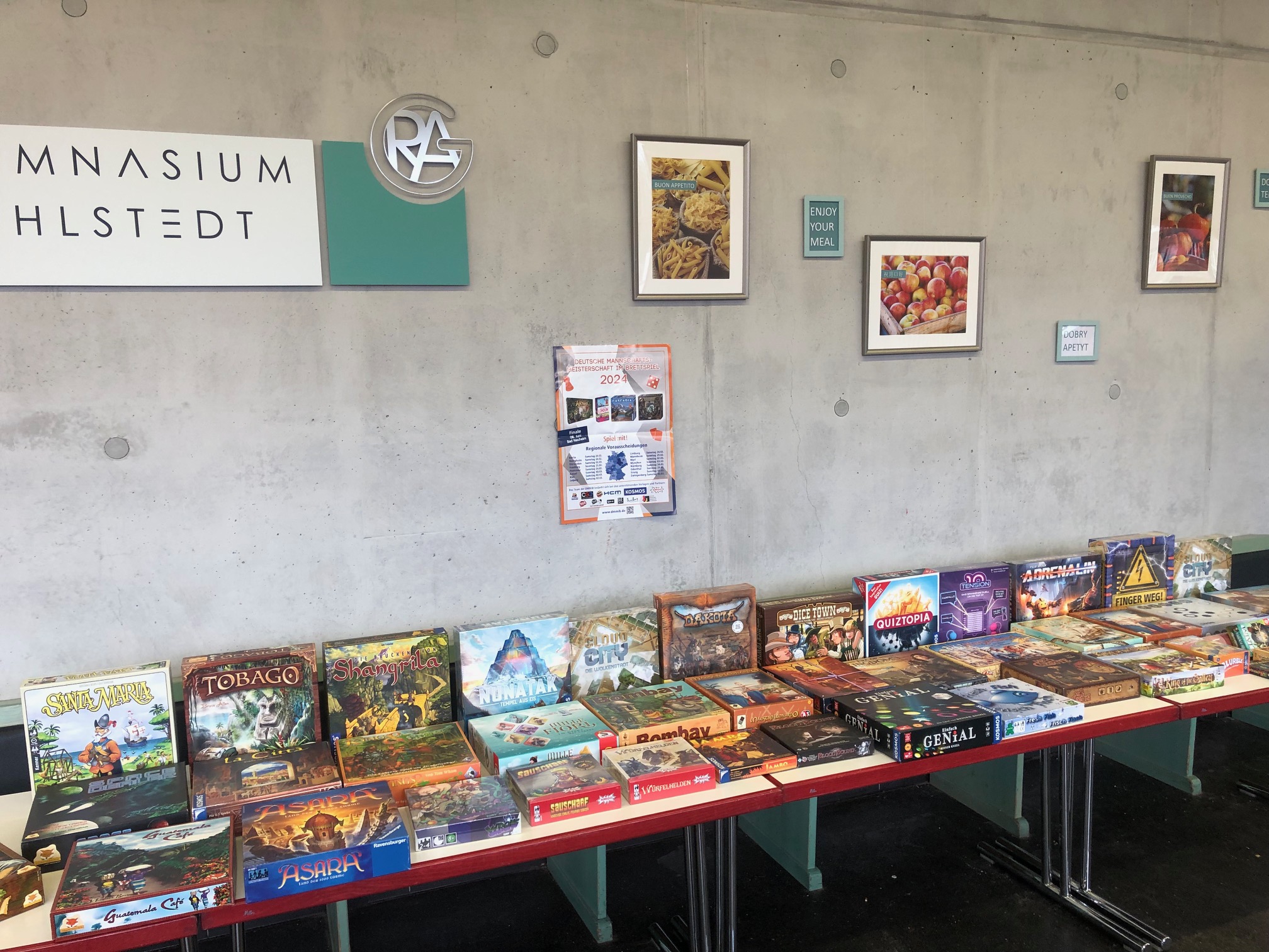Ein Tisch mit einer Vielzahl von Brettspielen, die ordentlich aufgereiht sind. Im Hintergrund sind Bilder an der Wand zu sehen. Die Tischoberfläche ist hell, und der Boden ist dunkel. Es gibt viel Tageslicht in dem Raum.