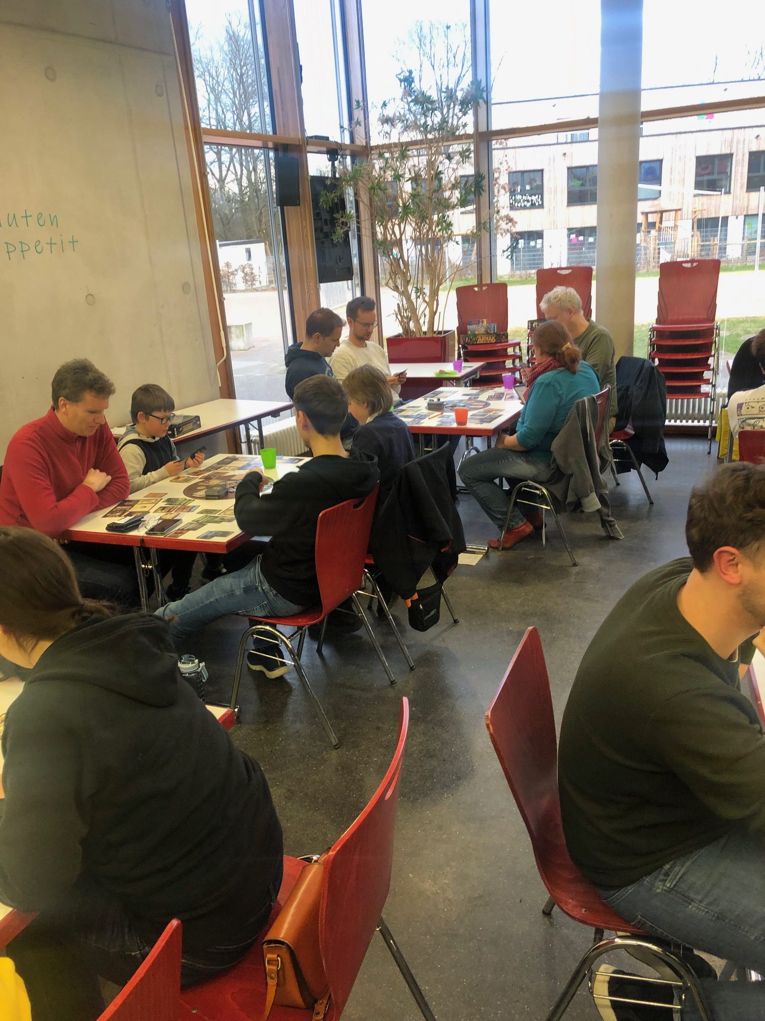 Eine Gruppe von Menschen versammelt sich in einem Raum. Im Vordergrund steht ein Mann, der spricht, während die anderen applaudieren. Die Anwesenden sind unterschiedlich gekleidet und zeigen diverses Alter. Der Raum hat eine moderne Atmosphäre mit Wänden aus Beton und einigen Fenstern im Hintergrund. Zwei Personen sitzen an einem Tisch, der mit verschiedenen Spielkarten und einem Spielbrett bedeckt ist. Im Hintergrund sind weitere Personen zu sehen, die ebenfalls an Tischen sitzen. Die Umgebung wirkt freundlich und gesellig, und es sind Getränke auf dem Tisch vorhanden. Eine Gruppe von Menschen sitzt an Tischen in einem hellen Raum mit großen Fenstern. Einige Personen lesen oder arbeiten an Projekten, während andere miteinander sprechen. Die Tische sind mit verschiedenen Materialien und Gegenständen bedeckt. Im Hintergrund sind rote Stühle gestapelt zu sehen. Eine Gruppe von Personen sitzt an Tischen in einem Raum, der für soziale Aktivitäten genutzt wird. Einige Teilnehmer sind beschäftigt, Karten oder Spielmaterialien zu betrachten, während andere miteinander sprechen. Die Umgebung ist hell und freundlich, mit Stühlen in verschiedenen Farben. Eine Gruppe von Menschen sitzt an Tischen in einem hellen Raum mit großen Fenstern. Sie sind mit verschiedenen Aktivitäten beschäftigt, während einige auf Papiere oder Materialien schauen. Die Tische sind mit Stühlen in Rot und Silber ausgestattet. Im Hintergrund sind weitere Personen sichtbar, die ebenfalls an den Tischen arbeiten. Ein Tisch mit verschiedenen Speisen und Snacks. Darunter sind Salate, Wurstwaren, Gebäck, Früchte und Desserts in verschiedenen Schalen und Platten angerichtet. Einige Schalen sind mit Beschriftungen versehen. Im Hintergrund sind bunte Becher zu sehen. Ein Tisch mit einer Vielzahl von Brettspielen ist in einem Raum aufgestellt. Im Hintergrund sind an einer Betonwand verschiedene Bilder und Schilder angebracht, darunter ein Schild mit der Aufschrift Eine Gruppen von Menschen sitzt an Tischen in einem hellen Raum mit großen Fenstern, die auf eine grüne Außenansicht blicken. Auf den Tischen liegen verschiedene Spiele. Die Atmosphäre wirkt gesellig und einladend, während die Teilnehmer sich unterhalten und miteinander interagieren. Eine Gruppe von Menschen sitzt an Tischen in einem großen Raum. Die Teilnehmer sind in konzentrierter Unterhaltung oder beim Spielen von Brettspielen. Der Raum hat große Fenster, die viel Tageslicht hereinlassen, und im Hintergrund sind weitere Tische und Stühle zu sehen.