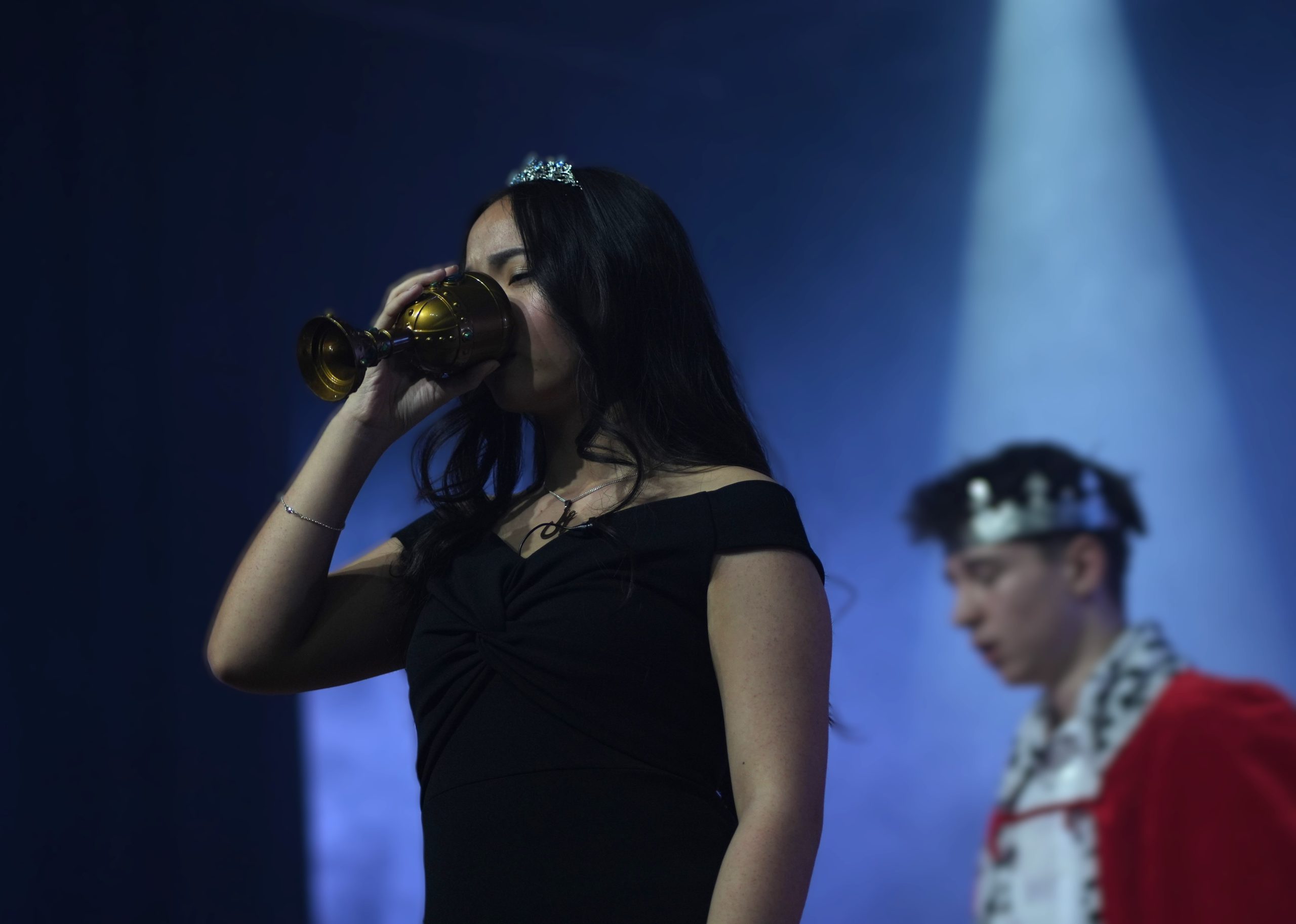 Eine Person mit langen, dunklen Haaren und einem Blumenkranz auf dem Kopf sitzt auf dem Boden und lächelt, während sie die Hände in einer klatschenden Geste zusammenführt. Im Hintergrund sind verschwommene Lichter und eine andere Person in formeller Kleidung zu sehen. Die Szene wirkt fröhlich und festlich. Zwei Personen auf einer Bühne, eine Person mit lockigem Haar trägt eine glitzernde Jacke und lächelt. Die andere Person sitzt daneben und sieht ebenfalls erfreut aus. Der Hintergrund ist unscharf. Junger Mann in einem weißen Hemd und einem schwarzen Hut, der ein Blatt Papier in der Hand hält und auf einer Bühne spricht. Der Hintergrund ist dunkel. Ein Mann in einem roten Umhang mit einer Krone steht mit einer Hand ausgestreckt auf einer Bühne. Im Hintergrund ist ein goldener Thron und ein Projektor zu sehen. Die Szenerie vermittelt eine königliche Atmosphäre. Zwei Personen sitzen nebeneinander auf einer Bühne. Die Frau auf der linken Seite lächelt und hält eine Getränkedose in der Hand, während der Mann auf der rechten Seite ebenfalls lächelt und in ihre Richtung schaut. Im Hintergrund sind festliche goldene Dekorationen zu sehen. Beide tragen schwarze Kleidung. Alt text not available Eine junge Frau in einem schwarzen Kleid hält ein goldfarbenes Trinkgefäß und trinkt daraus. Im Hintergrund ist ein junger Mann mit einer Krone und einem roten Umhang zu sehen, der leicht verschwommen ist. Die Szene ist von buntem Licht beleuchtet. Zwei Schauspielerinnen stehen auf einer Bühne. Die linke trägt einen rosa Pullover und schwarze Hosen, während die rechte eine auffällige orangefarbene Jacke mit Rüschen trägt und ebenfalls schwarze Hosen hat. Ein dritter Schauspieler in einem schwarzen Mantel steht vor ihnen und hält ein blaues Tuch. Im Hintergrund ist eine goldene Dekoration zu sehen. Eine Szene auf einer Bühne in einem dunklen Raum, in der mehrere Personen mit Taschenlampen zu sehen sind. Eine Person kniet auf dem Boden, während andere um sie herum stehen und das Licht auf sie richten. Die Atmosphäre ist dramatisch und die Kleidung der Darsteller ist überwiegend schwarz. Drei Schauspieler auf einer Bühne während einer Theateraufführung. Ein junger Mann in einem roten Umhang und einer Krone steht im Hintergrund. Im Vordergrund unterhält sich eine junge Frau in einem schwarzen Kleid mit einem jungen Mann in einem Anzug. Beide schauen sich an, während der König im Hintergrund beobachtet.
