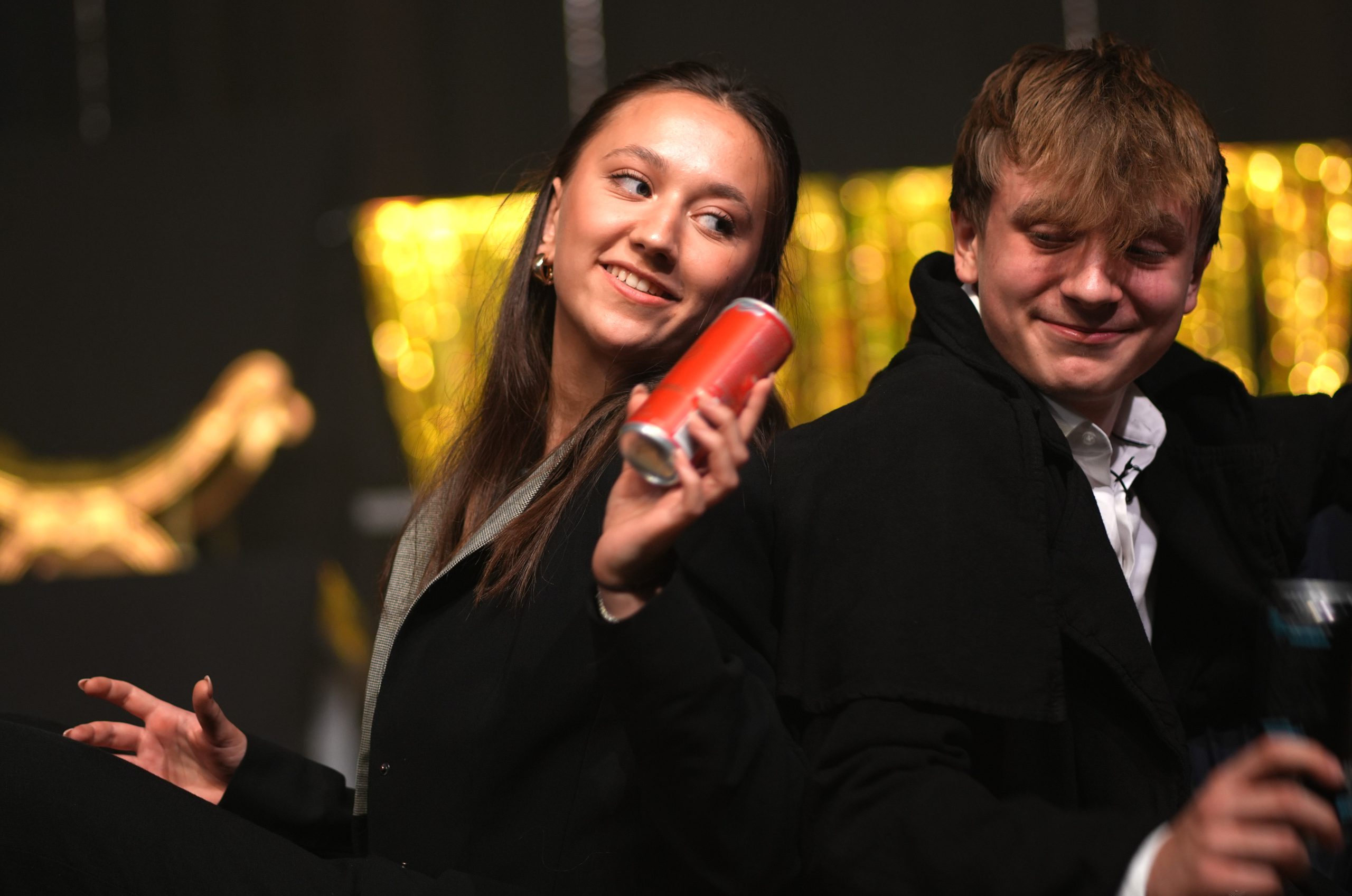 Eine Person mit langen, dunklen Haaren und einem Blumenkranz auf dem Kopf sitzt auf dem Boden und lächelt, während sie die Hände in einer klatschenden Geste zusammenführt. Im Hintergrund sind verschwommene Lichter und eine andere Person in formeller Kleidung zu sehen. Die Szene wirkt fröhlich und festlich. Zwei Personen auf einer Bühne, eine Person mit lockigem Haar trägt eine glitzernde Jacke und lächelt. Die andere Person sitzt daneben und sieht ebenfalls erfreut aus. Der Hintergrund ist unscharf. Junger Mann in einem weißen Hemd und einem schwarzen Hut, der ein Blatt Papier in der Hand hält und auf einer Bühne spricht. Der Hintergrund ist dunkel. Ein Mann in einem roten Umhang mit einer Krone steht mit einer Hand ausgestreckt auf einer Bühne. Im Hintergrund ist ein goldener Thron und ein Projektor zu sehen. Die Szenerie vermittelt eine königliche Atmosphäre. Zwei Personen sitzen nebeneinander auf einer Bühne. Die Frau auf der linken Seite lächelt und hält eine Getränkedose in der Hand, während der Mann auf der rechten Seite ebenfalls lächelt und in ihre Richtung schaut. Im Hintergrund sind festliche goldene Dekorationen zu sehen. Beide tragen schwarze Kleidung. Alt text not available Eine junge Frau in einem schwarzen Kleid hält ein goldfarbenes Trinkgefäß und trinkt daraus. Im Hintergrund ist ein junger Mann mit einer Krone und einem roten Umhang zu sehen, der leicht verschwommen ist. Die Szene ist von buntem Licht beleuchtet. Zwei Schauspielerinnen stehen auf einer Bühne. Die linke trägt einen rosa Pullover und schwarze Hosen, während die rechte eine auffällige orangefarbene Jacke mit Rüschen trägt und ebenfalls schwarze Hosen hat. Ein dritter Schauspieler in einem schwarzen Mantel steht vor ihnen und hält ein blaues Tuch. Im Hintergrund ist eine goldene Dekoration zu sehen. Eine Szene auf einer Bühne in einem dunklen Raum, in der mehrere Personen mit Taschenlampen zu sehen sind. Eine Person kniet auf dem Boden, während andere um sie herum stehen und das Licht auf sie richten. Die Atmosphäre ist dramatisch und die Kleidung der Darsteller ist überwiegend schwarz. Drei Schauspieler auf einer Bühne während einer Theateraufführung. Ein junger Mann in einem roten Umhang und einer Krone steht im Hintergrund. Im Vordergrund unterhält sich eine junge Frau in einem schwarzen Kleid mit einem jungen Mann in einem Anzug. Beide schauen sich an, während der König im Hintergrund beobachtet.
