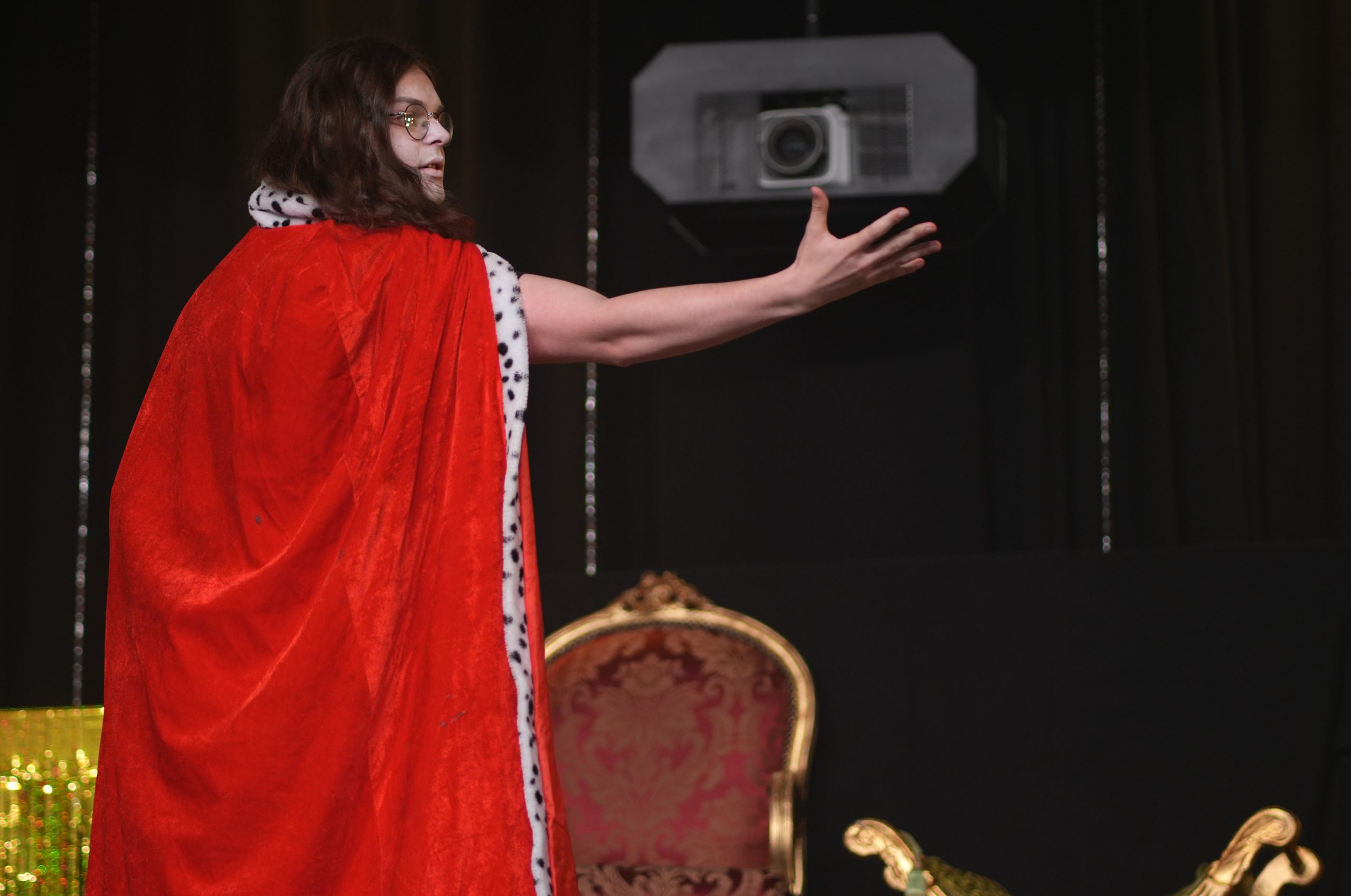 Eine Person mit langen, dunklen Haaren und einem Blumenkranz auf dem Kopf sitzt auf dem Boden und lächelt, während sie die Hände in einer klatschenden Geste zusammenführt. Im Hintergrund sind verschwommene Lichter und eine andere Person in formeller Kleidung zu sehen. Die Szene wirkt fröhlich und festlich. Zwei Personen auf einer Bühne, eine Person mit lockigem Haar trägt eine glitzernde Jacke und lächelt. Die andere Person sitzt daneben und sieht ebenfalls erfreut aus. Der Hintergrund ist unscharf. Junger Mann in einem weißen Hemd und einem schwarzen Hut, der ein Blatt Papier in der Hand hält und auf einer Bühne spricht. Der Hintergrund ist dunkel. Ein Mann in einem roten Umhang mit einer Krone steht mit einer Hand ausgestreckt auf einer Bühne. Im Hintergrund ist ein goldener Thron und ein Projektor zu sehen. Die Szenerie vermittelt eine königliche Atmosphäre. Zwei Personen sitzen nebeneinander auf einer Bühne. Die Frau auf der linken Seite lächelt und hält eine Getränkedose in der Hand, während der Mann auf der rechten Seite ebenfalls lächelt und in ihre Richtung schaut. Im Hintergrund sind festliche goldene Dekorationen zu sehen. Beide tragen schwarze Kleidung. Alt text not available Eine junge Frau in einem schwarzen Kleid hält ein goldfarbenes Trinkgefäß und trinkt daraus. Im Hintergrund ist ein junger Mann mit einer Krone und einem roten Umhang zu sehen, der leicht verschwommen ist. Die Szene ist von buntem Licht beleuchtet. Zwei Schauspielerinnen stehen auf einer Bühne. Die linke trägt einen rosa Pullover und schwarze Hosen, während die rechte eine auffällige orangefarbene Jacke mit Rüschen trägt und ebenfalls schwarze Hosen hat. Ein dritter Schauspieler in einem schwarzen Mantel steht vor ihnen und hält ein blaues Tuch. Im Hintergrund ist eine goldene Dekoration zu sehen. Eine Szene auf einer Bühne in einem dunklen Raum, in der mehrere Personen mit Taschenlampen zu sehen sind. Eine Person kniet auf dem Boden, während andere um sie herum stehen und das Licht auf sie richten. Die Atmosphäre ist dramatisch und die Kleidung der Darsteller ist überwiegend schwarz. Drei Schauspieler auf einer Bühne während einer Theateraufführung. Ein junger Mann in einem roten Umhang und einer Krone steht im Hintergrund. Im Vordergrund unterhält sich eine junge Frau in einem schwarzen Kleid mit einem jungen Mann in einem Anzug. Beide schauen sich an, während der König im Hintergrund beobachtet.