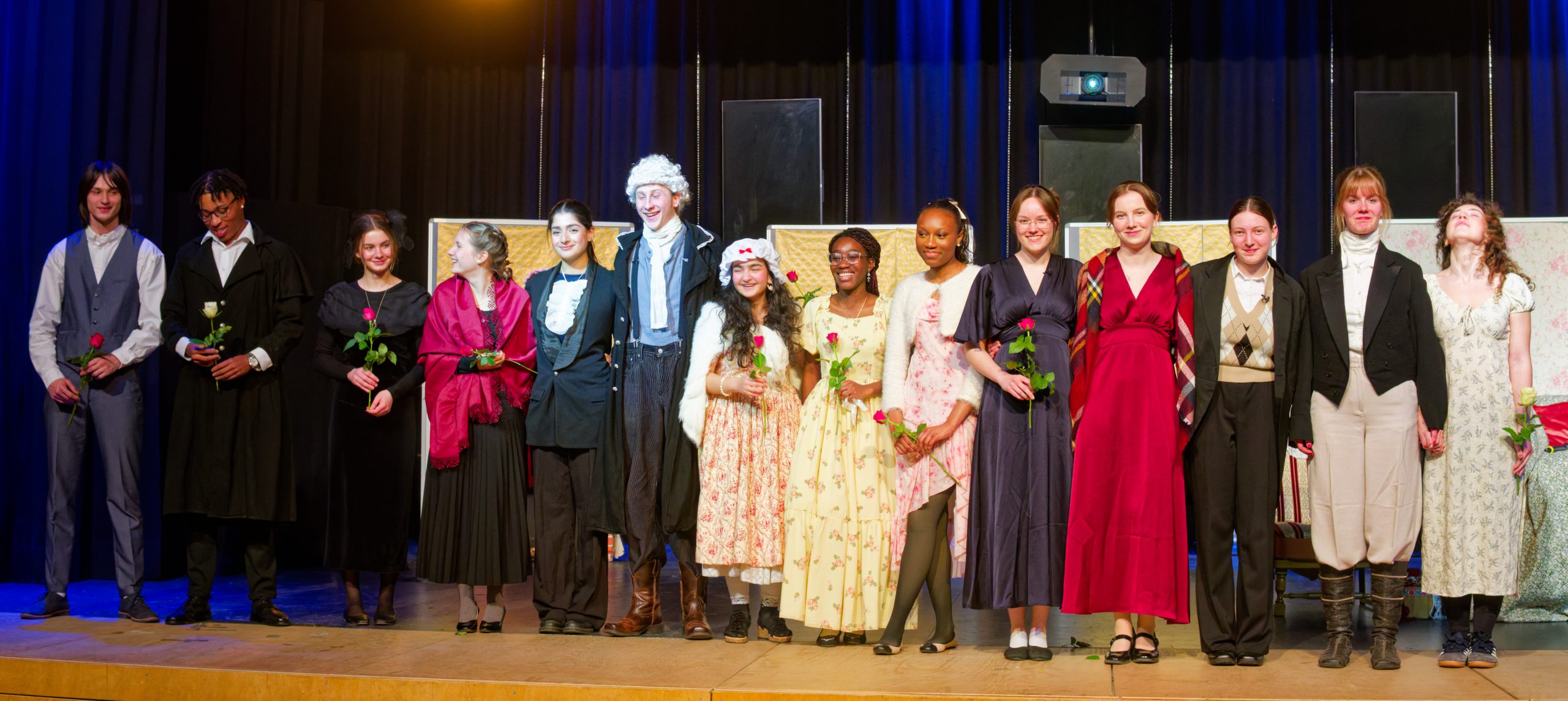 Eine Gruppe von zwölf Personen steht auf einer Bühne. Sie tragen historische Kostüme und halten jeweils eine Blume in der Hand. Im Hintergrund sind zwei große Lautsprecher und eine dunkle Vorhangwand zu sehen. Die Personen lächeln und scheinen am Ende einer Aufführung zu stehen.