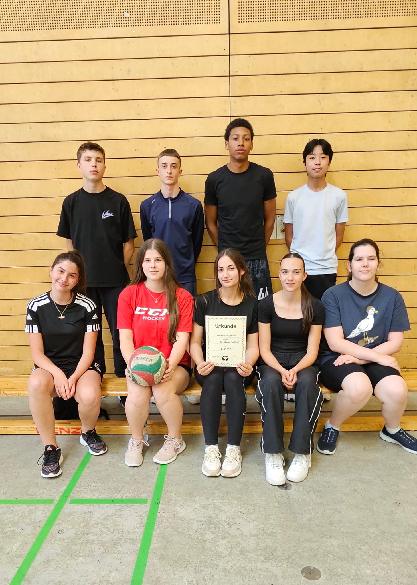 Eine Sporthalle mit einem Volleyballnetz, in der ein Volleyballspiel stattfindet. Auf der linken Seite sind Spielerinnen in Bewegung, während auf der rechten Seite Zuschauer auf Bänken sitzen. Die Halle hat eine helle, offene Atmosphäre mit Holzwänden und einem Sportboden. In einer Sporthalle sind mehrere Personen aktiv beim Volleyballspielen. Im Vordergrund stehen zwei Spielerinnen, eine in schwarzem und eine in pinkem Shirt. Im Hintergrund sitzen Zuschauer, die das Spiel beobachten. An den Wänden sind Volleyballnetze und Basketballkörbe sichtbar. Der Boden ist mit Linien für verschiedene Sportarten markiert. Gruppe von Jugendlichen in einer Sporthalle, die zusammen posieren. Sie stehen und sitzen auf dem Boden, einige halten ein Zertifikat oder eine Auszeichnung. Die Gruppe trägt sportliche Kleidung in verschiedenen Farben. Im Hintergrund ist eine Holzwand zu sehen. Gruppenbild von insgesamt acht Personen in einer Sporthalle. Oben stehen fünf Jugendliche in Sportkleidung, darunter zwei Männer und drei Frauen. Unten sitzen drei Frauen und ein Mann, eine von ihnen hält eine Urkunde und eine Volleyball. Der Hintergrund besteht aus einer Holzwand und einem Sportboden.