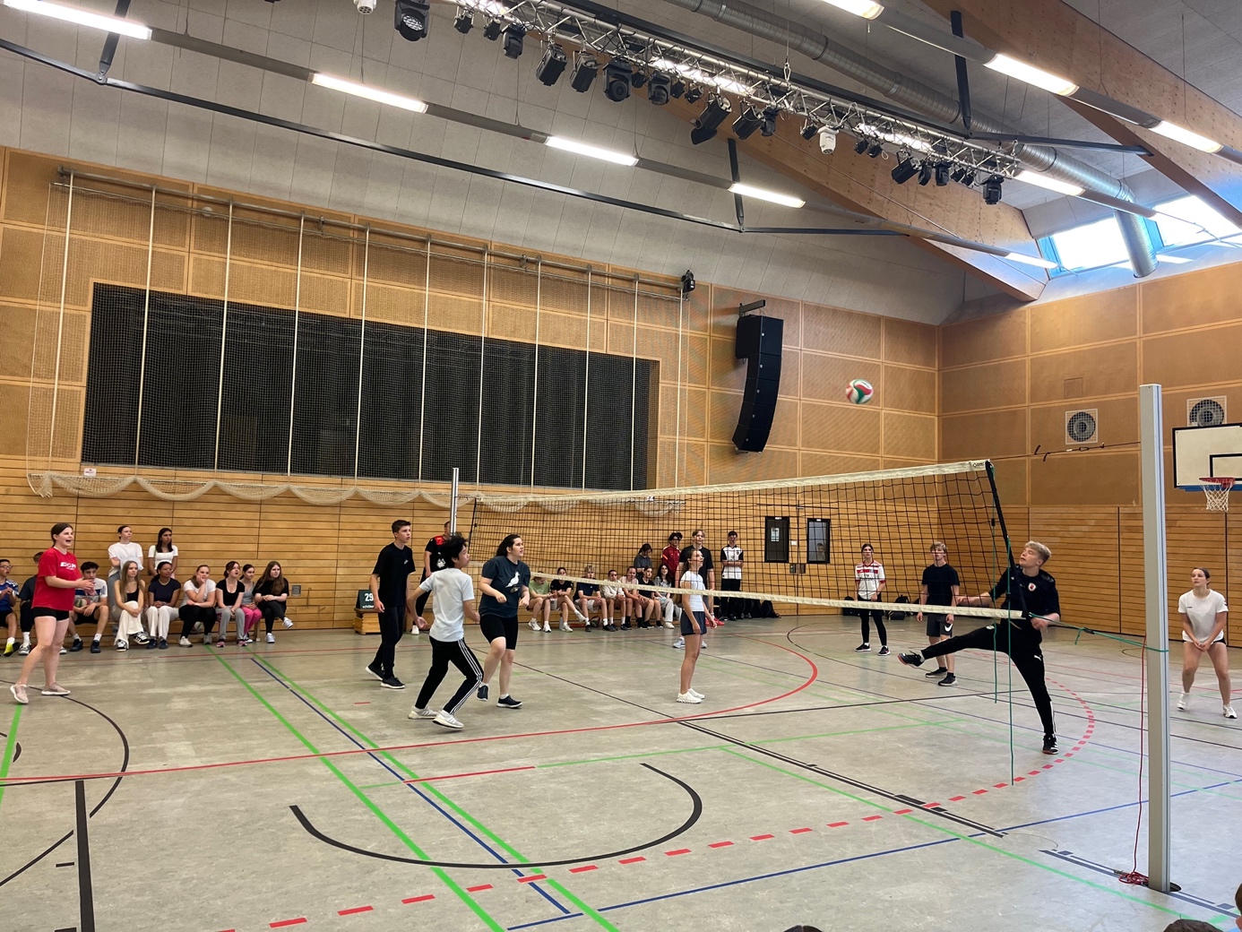 Am letzten Montag des Schuljahres (15.07.24) fand das langersehnte Volleyballturnier der neunten Klassen statt. In insgesamt 25 fesselnden Spielen kämpfte je ein Mixed-Team pro Klasse in zwei verschiedenen Gruppen um den Sieg. Auch die IVK (Internationale Vorbereitungsklasse) trat mit einem Mixed-Team an und kämpfte bis zum Schluss unermüdlich um jeden Punkt.