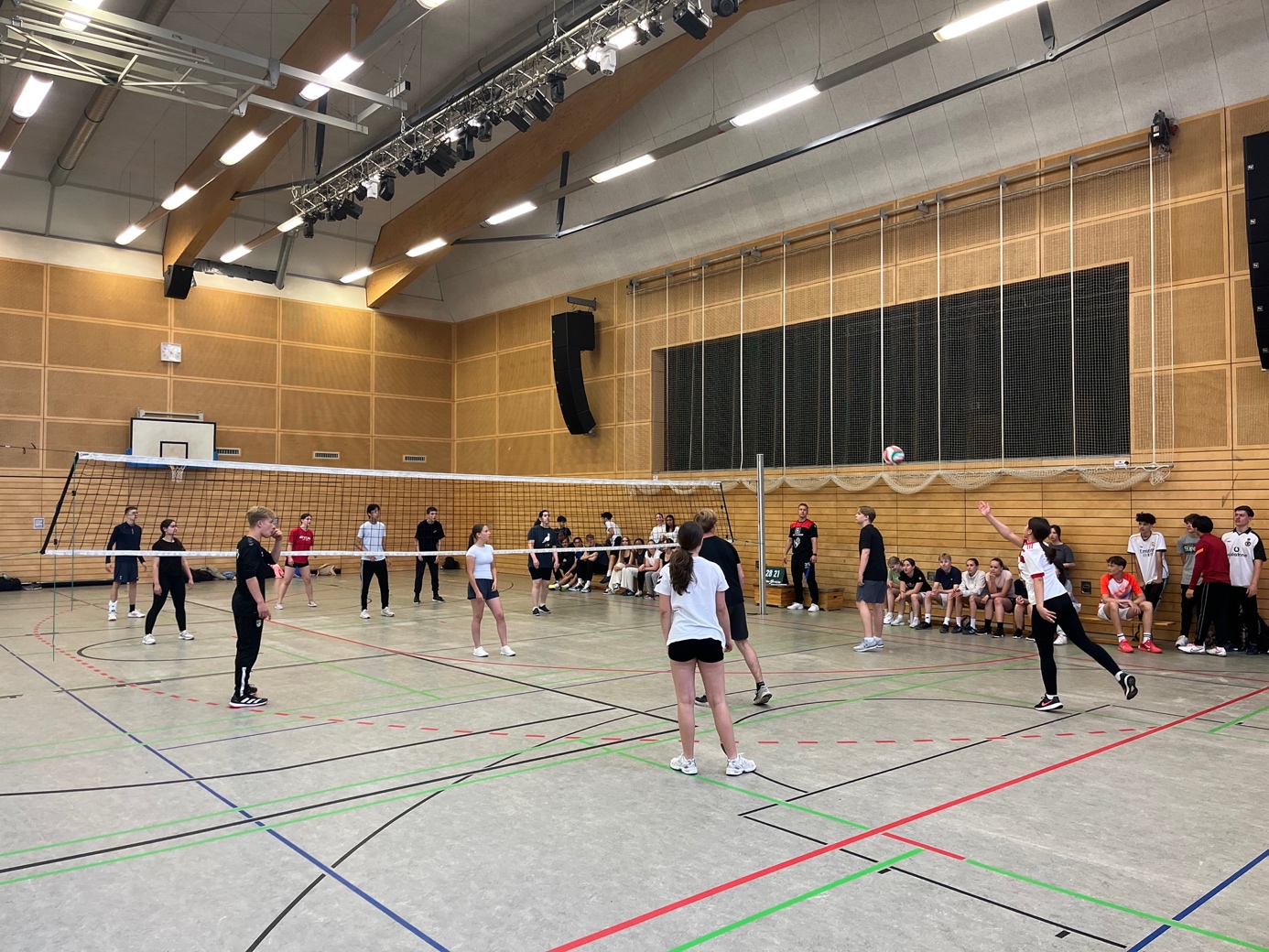Am letzten Montag des Schuljahres (15.07.24) fand das langersehnte Volleyballturnier der neunten Klassen statt. In insgesamt 25 fesselnden Spielen kämpfte je ein Mixed-Team pro Klasse in zwei verschiedenen Gruppen um den Sieg. Auch die IVK (Internationale Vorbereitungsklasse) trat mit einem Mixed-Team an und kämpfte bis zum Schluss unermüdlich um jeden Punkt.