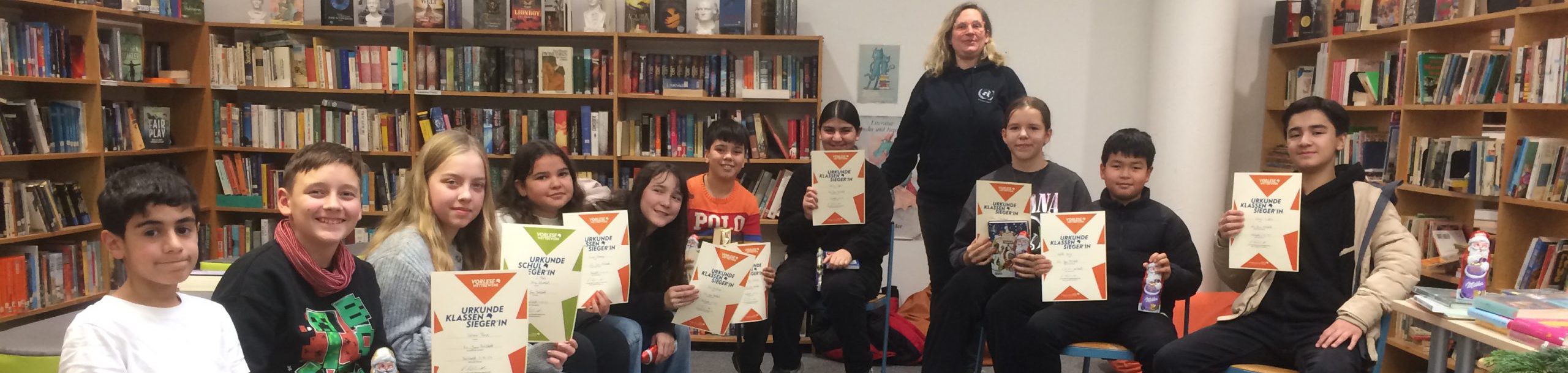 Die Entscheidung, welche Schülerin oder welcher Schüler der 6. Klasse zum Schulsieger gekürt wird, fand dieses Jahr wieder traditionell in der weihnachtlich geschmückten Schülerbibliothek statt. Nachdem die Deutschlehrkräfte gemeinsam mit allen sechs Klassen jeweils eine Klassensiegerin und ein Klassensieger gefunden hatten, traten diese gemeinsam zum Schulentscheid an.