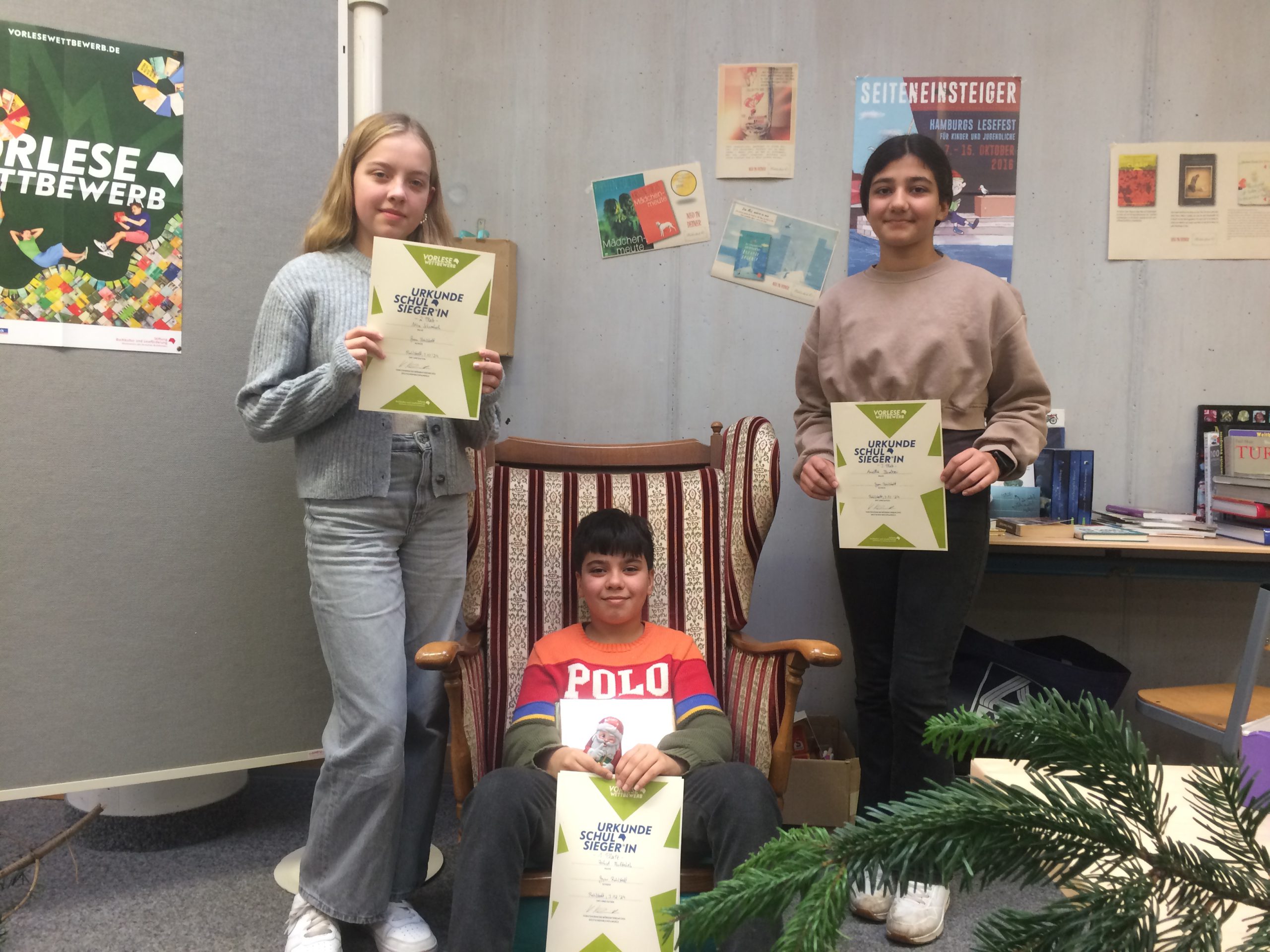 Die SiegerInnen des Vorlesewettbewerbs — 1. Zahid Multaheb (6e), 2. Nina Schwabach (6c), 3. Ariella Barekzai (6b)