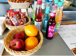 Zusätzlich zu den Angeboten in der Mensa wird in allen Pausen im Atrium unser Kiosk geöffnet, in dem sich Schülerinnen und Schüler durchgehend jetzt mit mehr frischen, saisonalen, gesunden und nicht industriell verpackten Nahrungsmitteln, etwa vorgeschnittenem Obst, Joghurt mit Müsli-Topping, Milchreis, Gemüsesticks, Salaten und Getränken versorgen können.