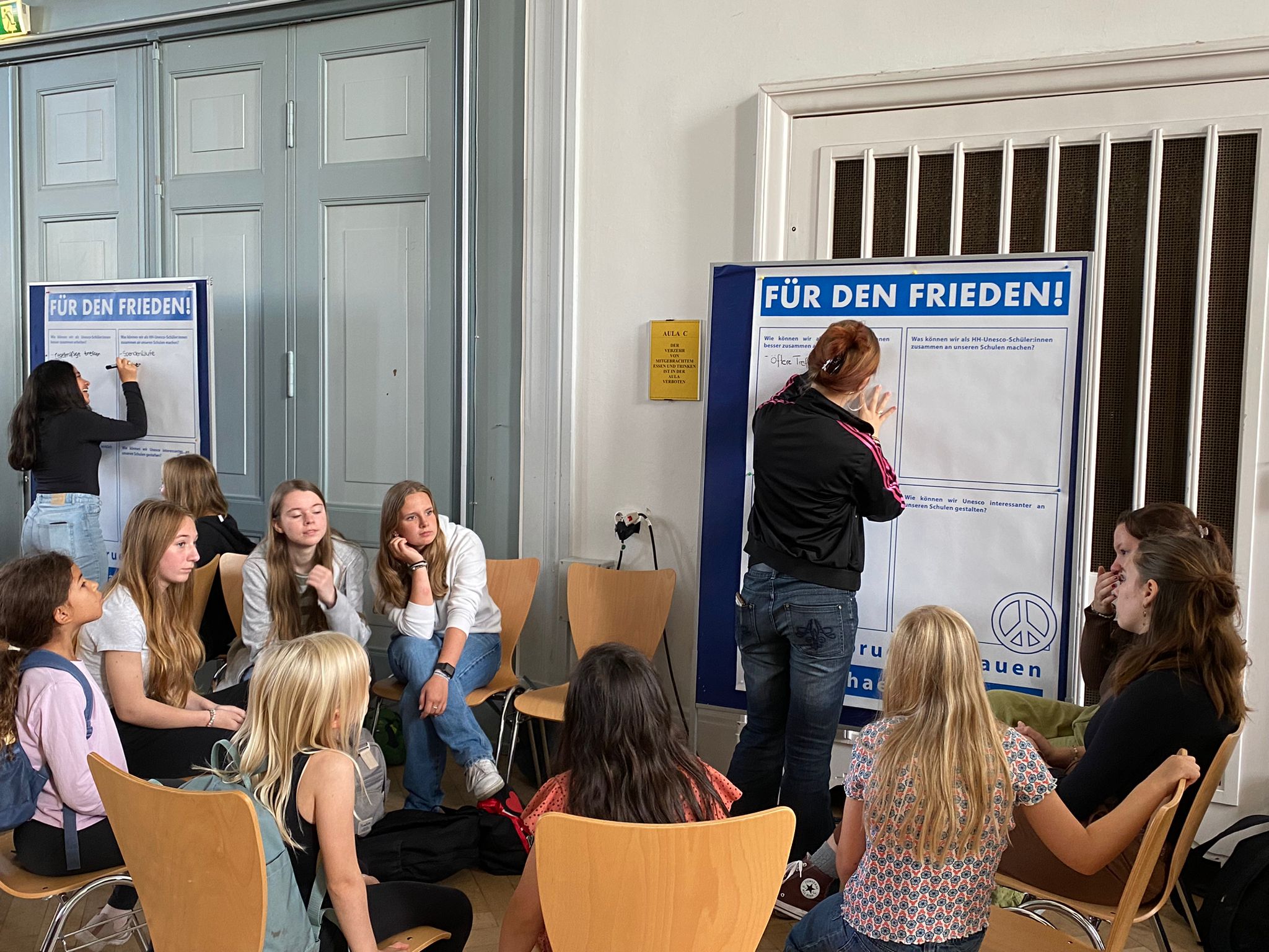 Endlich sollten sich einmal die Schüler*innen der verschiedenen Schulen kennenlernen und austauschen – und so kamen Delegationen fast aller Altersstufen vom Helene-Lange- Gymnasium, der ältesten UNESCO-Projektschule Deutschlands, vom Grootmoor, der Grundschule Arnkielstraße und natürlich wir vom GyRa, um gemeinsam über Frieden und Nachhaltigkeit nachzudenken und vor allem auch darüber, wie wir selbst wirksam werden können. Wir danken der Heinrich-Hertz-Schule für den schönen Tag, die Gastfreundschaft und die tolle Organisation des Tages! Was für eine wunderbare Gelegenheit, die Stärke und den Zusammenhalt des Netzwerks zu erleben und gemeinsam für den Frieden einzustehen!