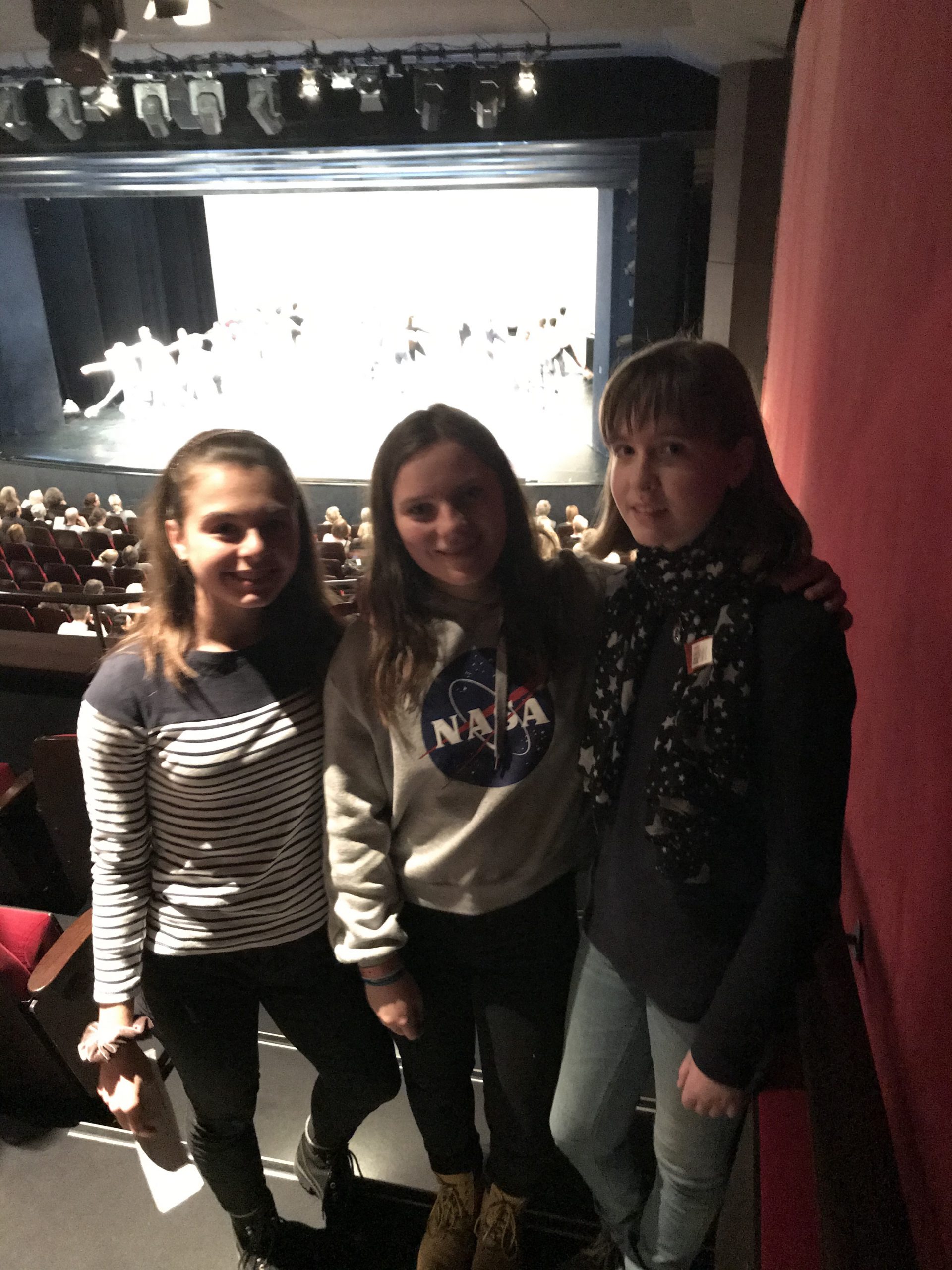Drei Personen stehen in einem Theater, im Vordergrund, lächelnd und nebeneinander. Im Hintergrund ist die Bühne sichtbar, auf der eine Aufführung stattfindet. Die Zuschauer sitzen in dunklen Reihen. Blick auf eine Bühne mit einer Gruppe von Darstellern, die auf einem dunklen Bühnenhintergrund stehen. Im Vordergrund sind die Köpfe und Schultern von Zuschauern in einem gut besetzten Zuschauerraum sichtbar. Die Bühne ist schwach beleuchtet und zeigt die Darsteller in verschiedenen Positionen.