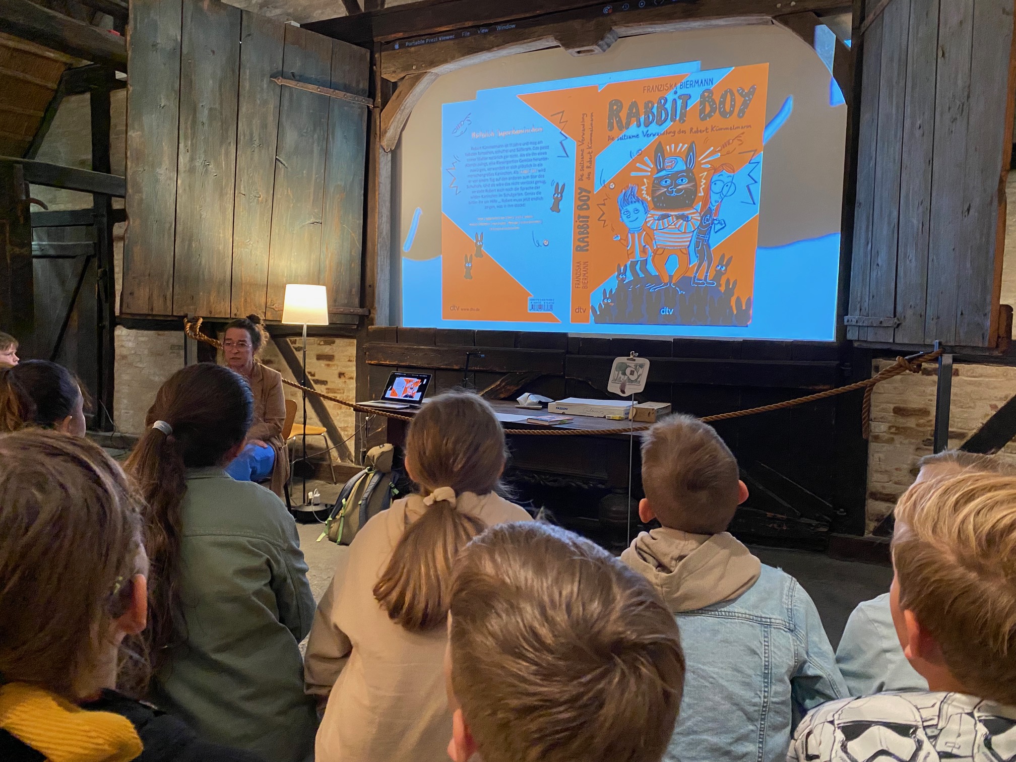 Diesen Fragen ist die Klasse 5a bei einem Workshop im Kinderbuchhaus im Museum Altona nachgegangen. Die Autorin Franziska Biermann las aus ihrem illustrierten Buch “Rabbit Boy” vor, in dem sich ein Junge in einen Hasen verwandelt und mit Hilfe von Verbündeten einen Fall aufklärt. Gespannt hörten alle zu und ließen sich mit Fantasie und vielfältigen Ideen auf die Geschichte ein. Anschließend wurden selbst Tierverwandlungen gezeichnet und gemalt und erste Ideen für eigene Geschichten notiert.