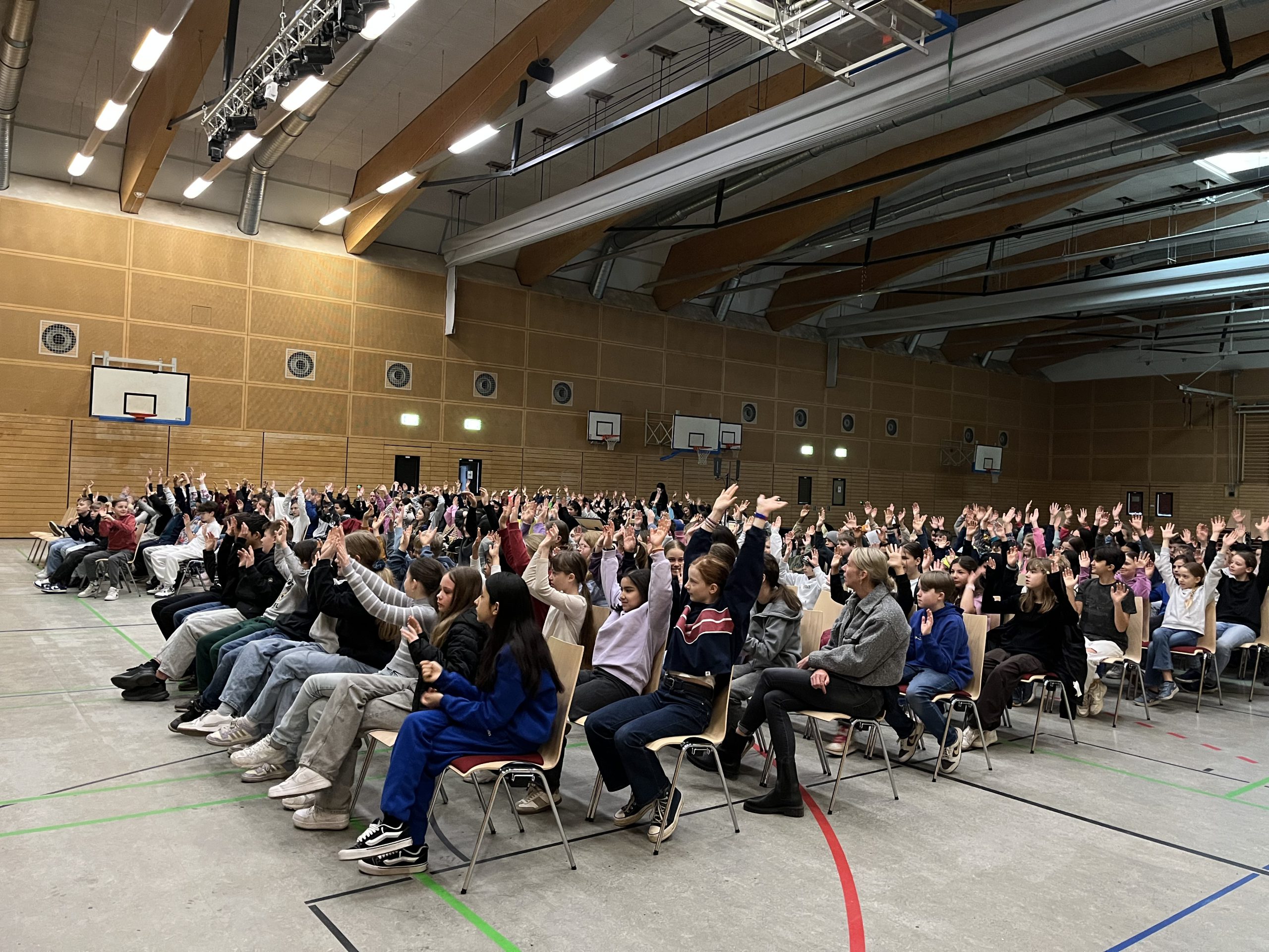 Eine große Gruppe von Schülern sitzt in einem Veranstaltungsraum und hebt die Hände. Im Hintergrund ist eine Leinwand mit einer Präsentation zu sehen. Die Atmosphäre wirkt lebhaft und interaktiv.