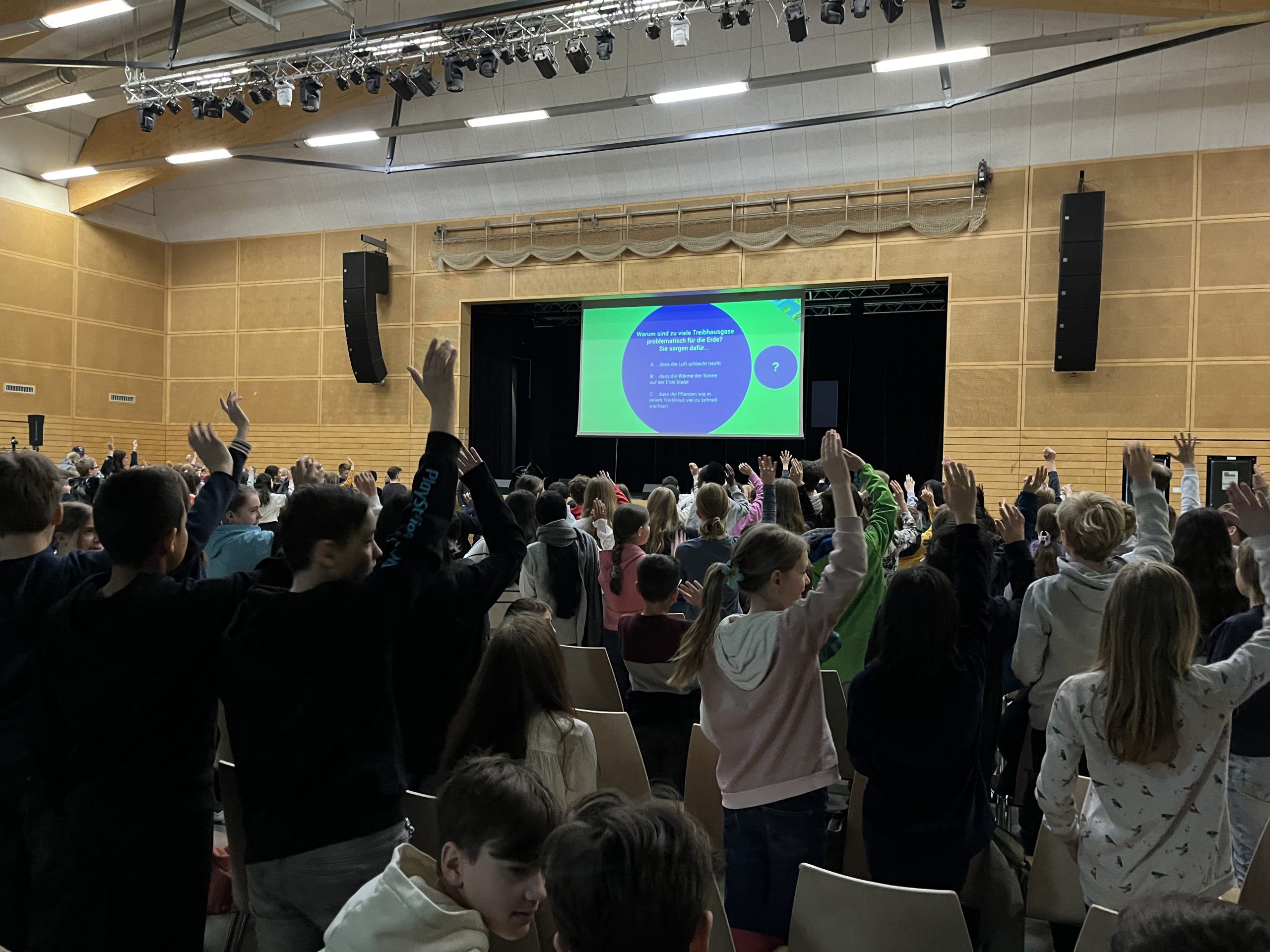 Eine große Gruppe von Schülern sitzt in einem Veranstaltungsraum und hebt die Hände. Im Hintergrund ist eine Leinwand mit einer Präsentation zu sehen. Die Atmosphäre wirkt lebhaft und interaktiv.