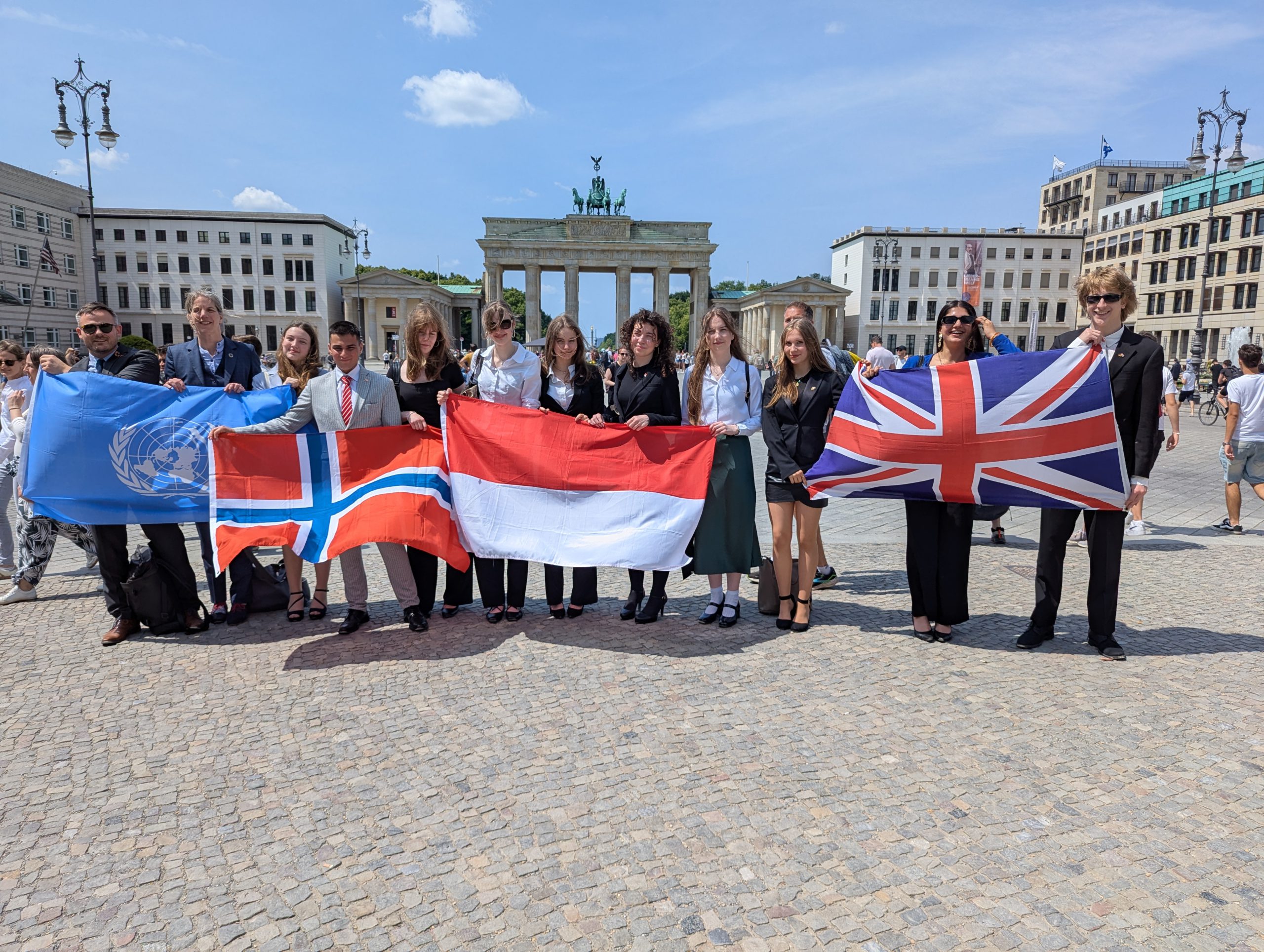 Gruppe von Menschen steht vor einem historischen Gebäude und hält verschiedene Nationalflaggen, darunter die Flaggen von Norwegen, Indonesien und Großbritannien. Es ist ein sonniger Tag mit klarem Himmel.