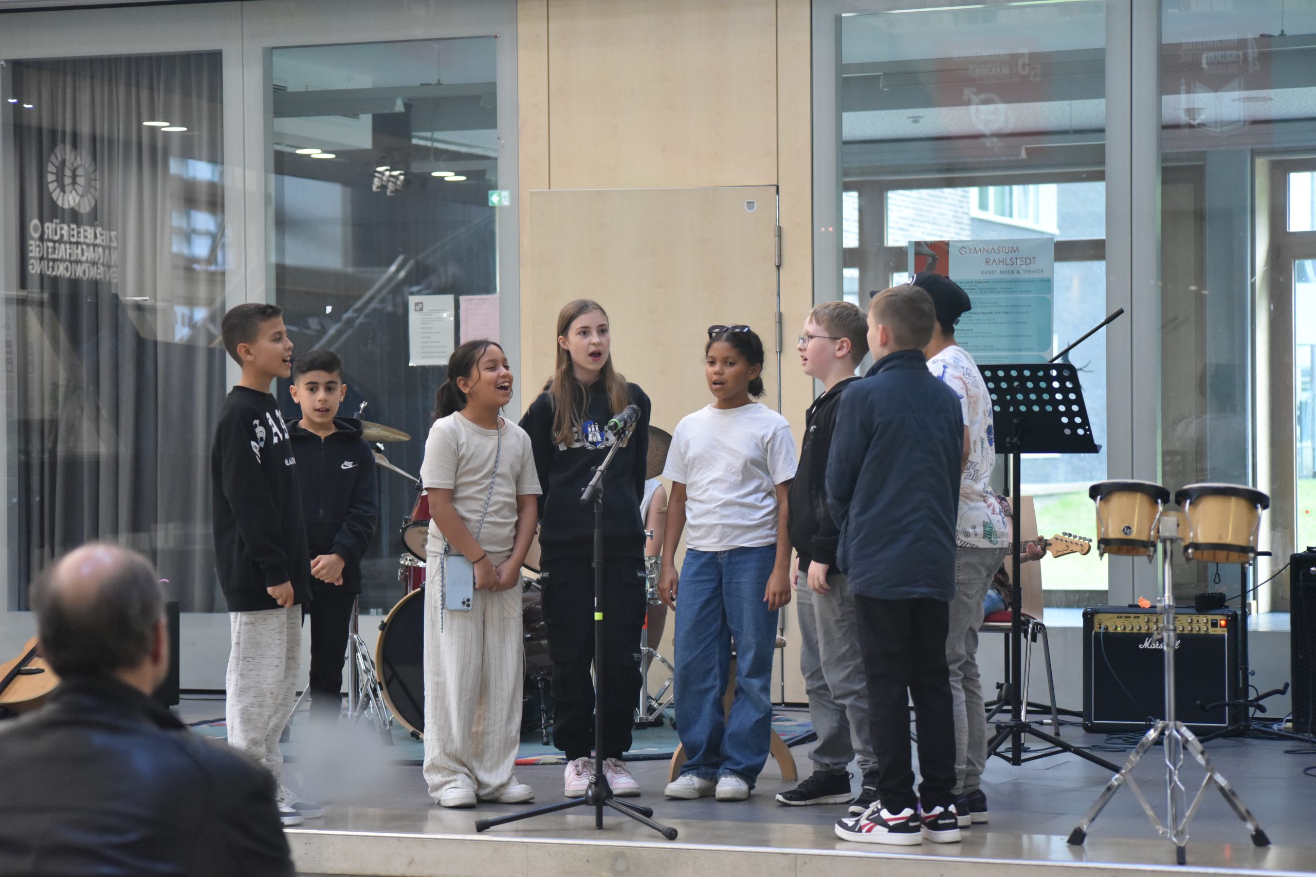Erst seit Beginn des Schuljahrs gibt es die neue Band aus Jg. 5. Begleitet von Herrn Krösser am Klavier, gaben Ella (5f) an der E-Gitarre und Nelio (5b) am Schlagzeug ihr Debüt. Eine kleine Gruppe aus dem großen Chor von Herrn Krösser stimmte dazu „Endlich Sommer“ von Miguel Gaspar an. Als Motto für die zukünftige Weiterarbeit kündigte Herr Krösser den zweiten Titel „See you again“ von Wiz Khalifa an; Neuzugänge für die Band aus den Jahrgängen 5-7 sind jederzeit herzlich willkommen!