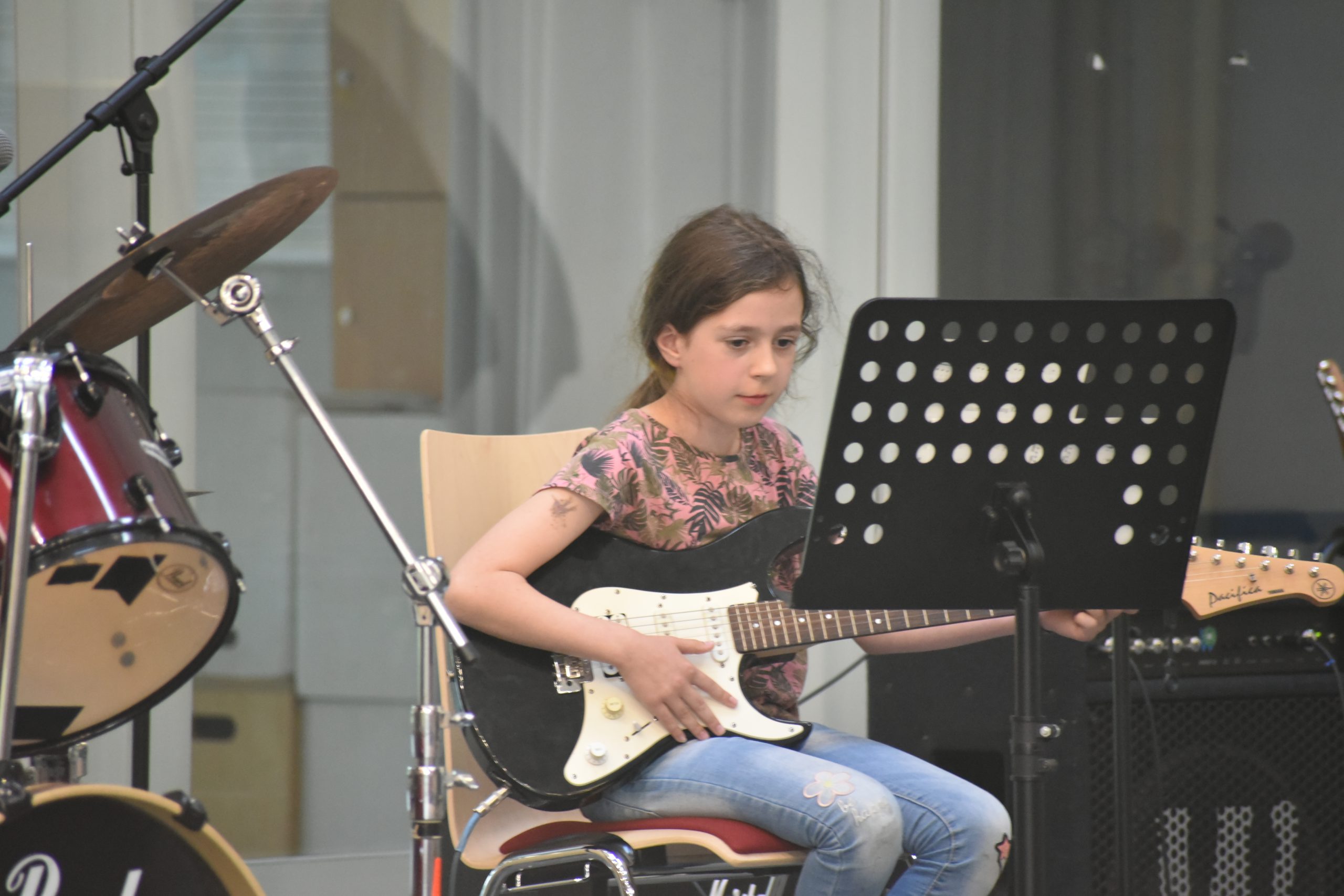 In diesem Jahr begann das Bandkonzert am 17. Juni im Atrium mit einem besonderen Präludium: Zur Einstimmung spielte Iva Andrejic (9b) „Songe Capricorne“ des französischen Gitarristen und Komponisten Roland Dyens (1955-2016), eine Komposition für Gitarre solo, die sehr ruhig beginnt, dann jedoch deutlich an Fahrt aufnimmt und schließlich wieder nachdenklich endet. Nachdem Iva kürzlich im Lübecker Bundeswettbewerb „Jugend musiziert“ einen beachtlichen zweiten Preis gewonnen hat – herzlichen Glückwunsch! –, haben wir uns sehr gefreut, dass sie nun auch unsere Schule an ihrer professionellen Präsenz und virtuosen Musikalität teilhaben ließ.