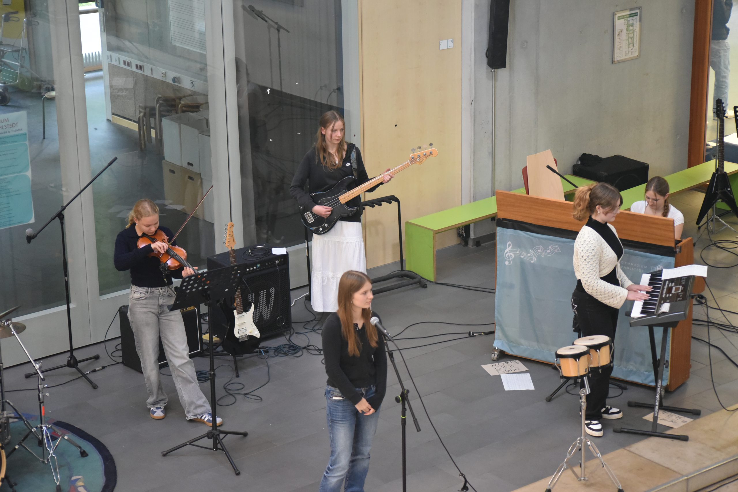 Da die Improvisation integraler Bestandteil der Rockmusik ist, gelang es der Mittelstufenband, den krankheitsbedingten Ausfall einer Sängerin durch souveränes Instrumentalspiel auszugleichen. Hier überzeugte besonders Elif (9c) durch ihren Klangfarbenreichtum am Flügel („Complicated“ von Avril Lavigne). Sophia (9d) beeindruckte wie immer durch ihre kraftvolle Präsenz am Schlagzeug und bezog sogar das Publikum mit ein. Helen (9c) begeisterte mit ihrem Gesang zu „Price Tag“ der britischen Sängerin Jessie J. aus dem Jahr 2011 und zu „Seven Years“ von Lukas Graham, einem Coming-of-age-Song über den Wert der Freundschaft und über die Poesie des Alltags. Den Begleitapparat sicherten Nele (9d) am Klavier, Helena (9d) auf der Geige, Stella (9c) an Keyboard und Bongos und Jule (9d) am E-Bass. Besonders mitreißend gelang „Riptide“, ein Indie-Popsong des australischen Singer-Songwriters Vance Joy, dessen Intention es war, einfach gute Laune zu verbreiten.