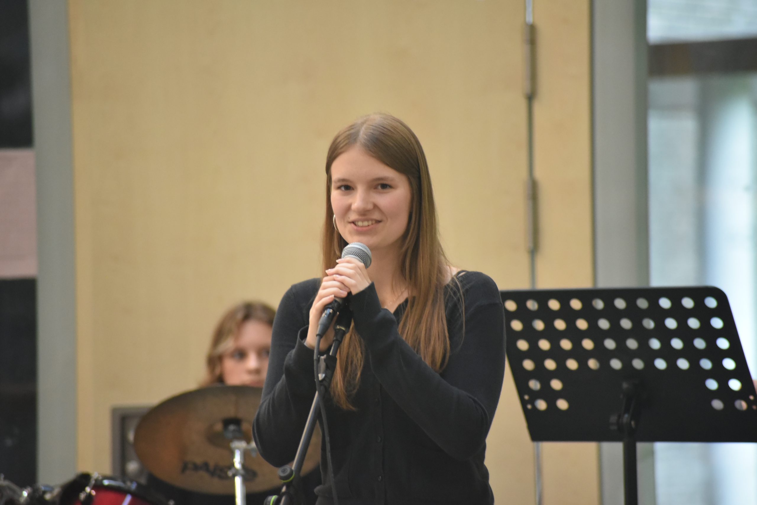 Die Herausforderung, sich mitten im Schuljahr neu zu erfinden, hatte sich der Oberstufenband gestellt. Bestand die Band zu Beginn des Schuljahrs noch aus acht Personen, fanden sich Leyana (E-Gitarre), Roschana (Gesang) und Moritz (Trompete/Cajón), alle S2, seit der Abiturvorbereitung der fünf Gründungsmitglieder alleine wieder. Die drei machten aus der Not eine Tugend, experimentierten mit digitalen Backing-Tracks und komponierten sogar einen eigenen Song.