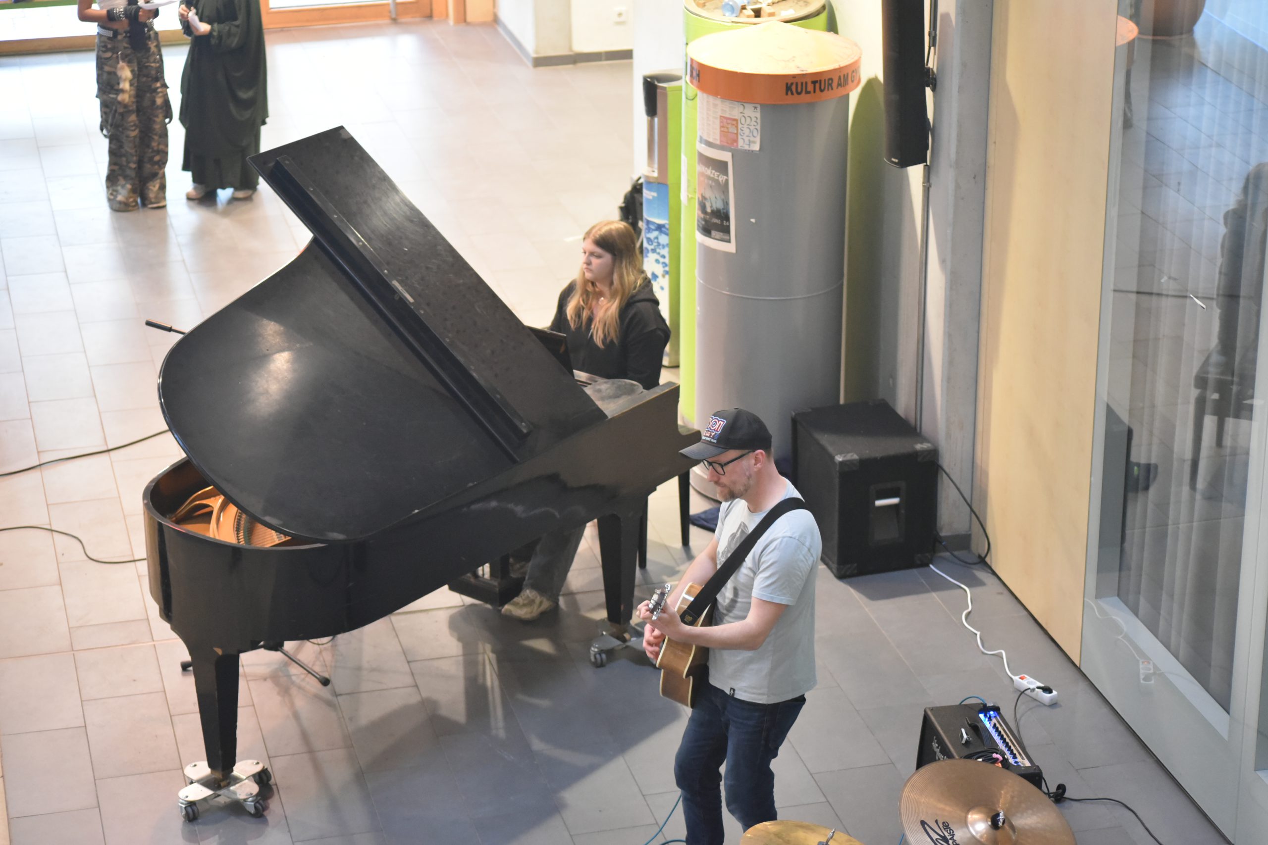 Die Herausforderung, sich mitten im Schuljahr neu zu erfinden, hatte sich der Oberstufenband gestellt. Bestand die Band zu Beginn des Schuljahrs noch aus acht Personen, fanden sich Leyana (E-Gitarre), Roschana (Gesang) und Moritz (Trompete/Cajón), alle S2, seit der Abiturvorbereitung der fünf Gründungsmitglieder alleine wieder. Die drei machten aus der Not eine Tugend, experimentierten mit digitalen Backing-Tracks und komponierten sogar einen eigenen Song.