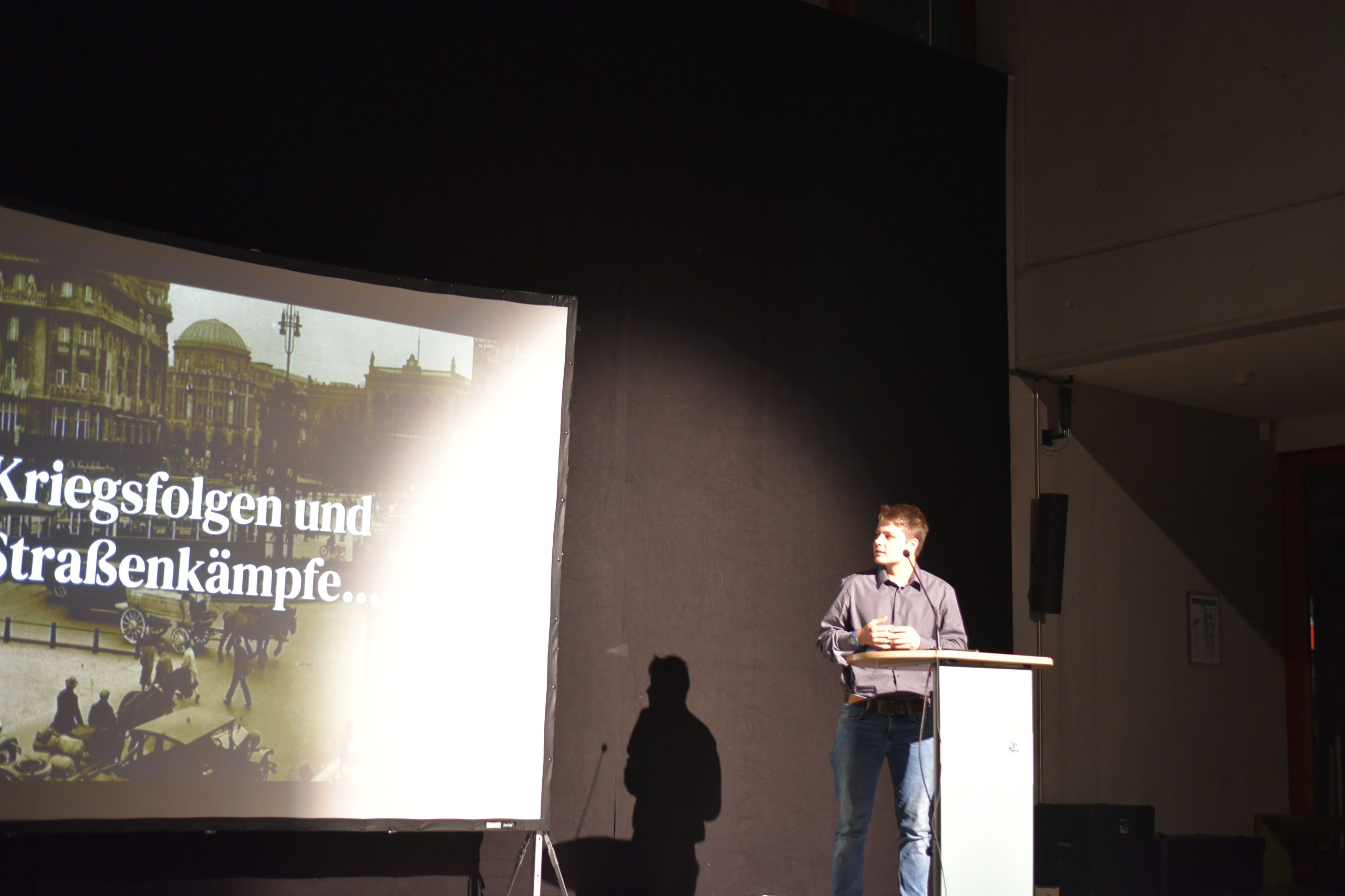 Am 28. Februar 2024 herrschte eine besondere Stimmung im Atrium des GyRa: Charleston-Klänge bei lauschiger Beleuchtung entführten das allmählich eintreffende Publikum in die 1920er Jahre. Durch Serien wie Babylon Berlin ist diese Epoche, auch bekannt als die „Goldenen Zwanziger Jahre“, 100 Jahre später wieder sehr präsent. Doch wie golden waren diese Jahre wirklich? Welche Klischees werden in den Medien darüber vermittelt, und was steckt dahinter?